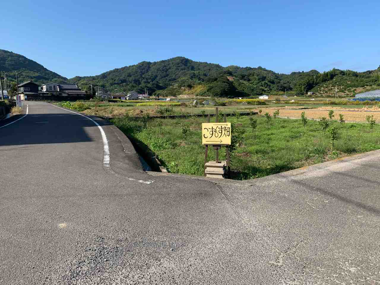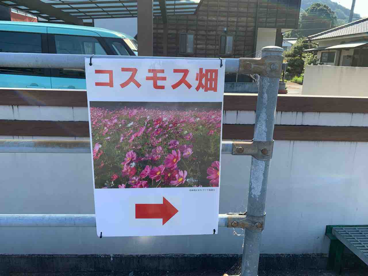 信号を右折すると、直ぐ左ガードレールに「コスモス畑」の看板が目に付きます。