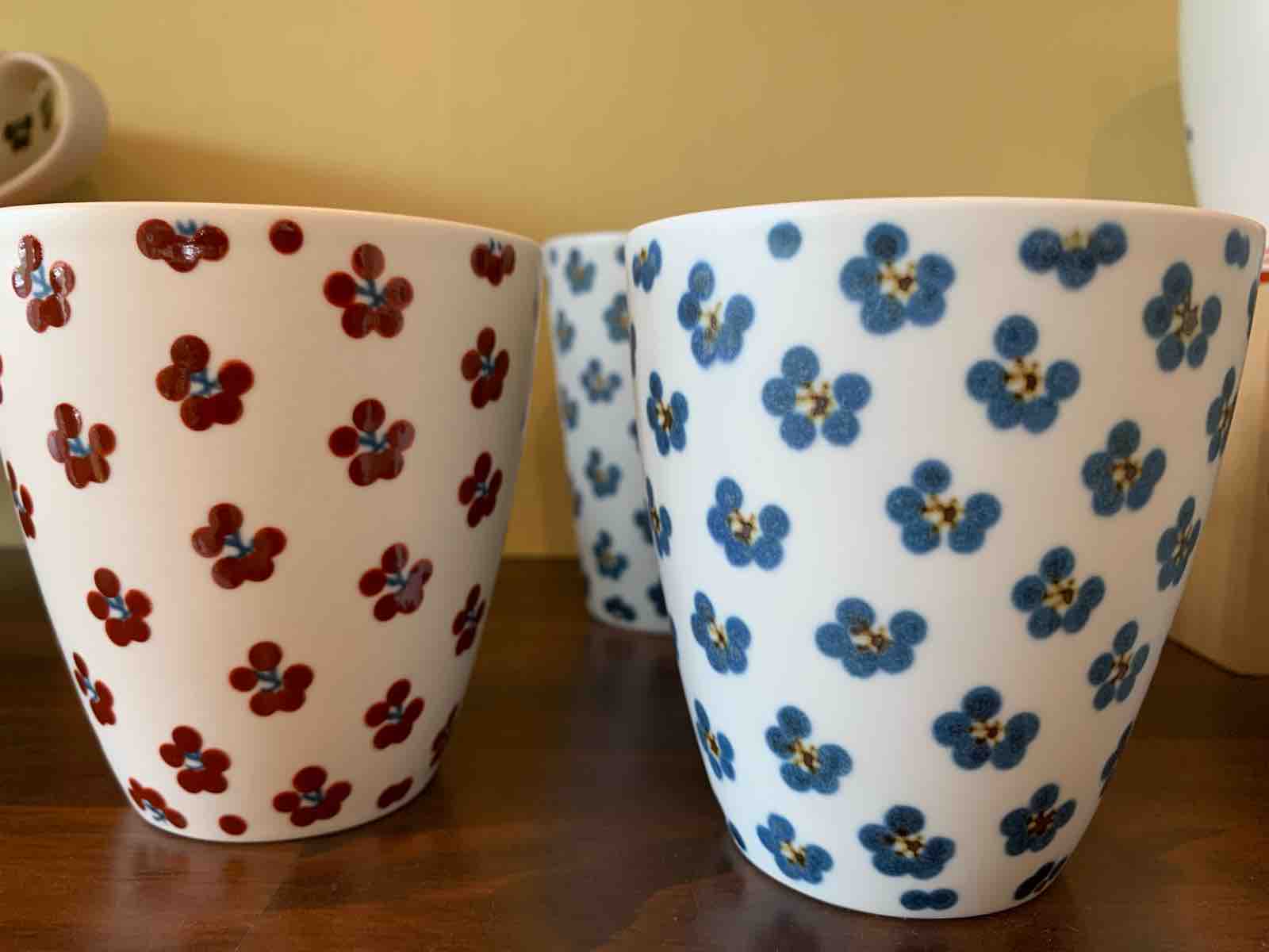 可愛らしいお花模様(赤小紋・青小紋)と艶消しのマットな質感が特徴の湯呑み。