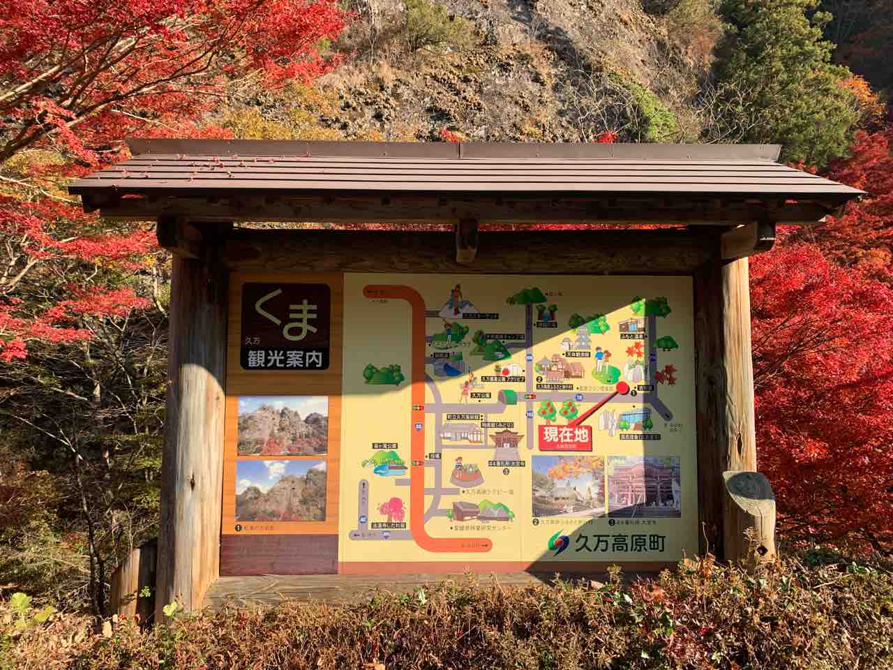 「くま観光案内」後方に見えるのは、約2000万年前の地層が残る「礫岩峰」が見事な国指定の名勝地です。そして紅葉(もみじ)狩りの人気スポットでもあります。