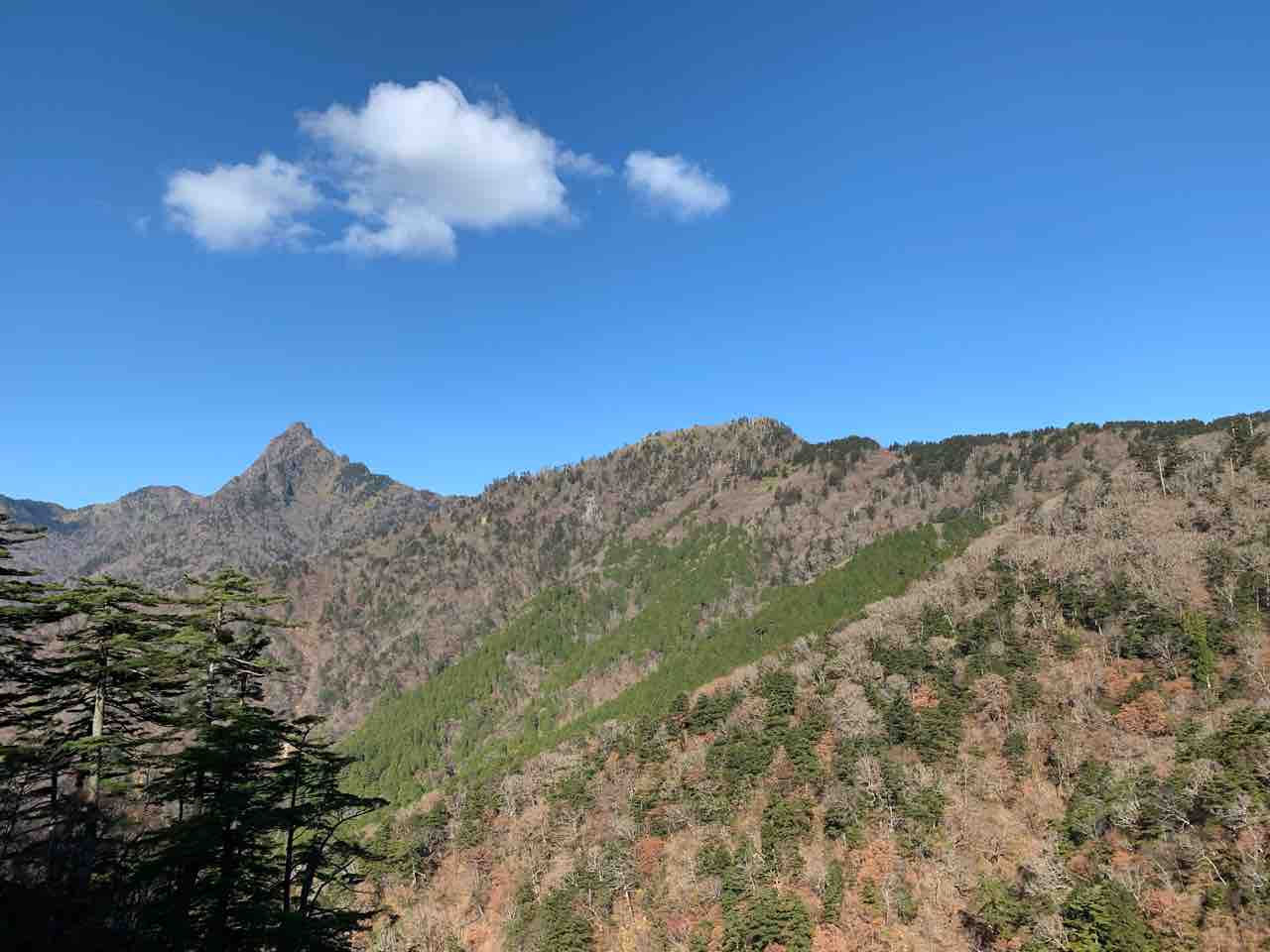 もう、すっかり紅葉のピークは過ぎていました。天気は良かったので、石鎚山の稜線がはっきり分かります。
