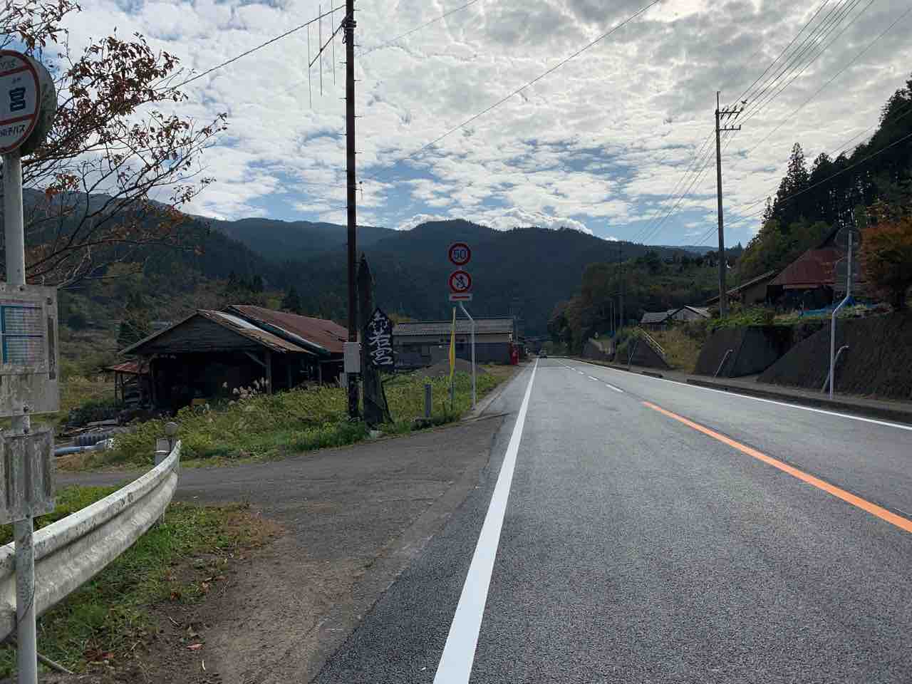 右手にある道の駅「天空の郷さんさん」を過ぎて約5.8km走ると「落合交差点」信号。