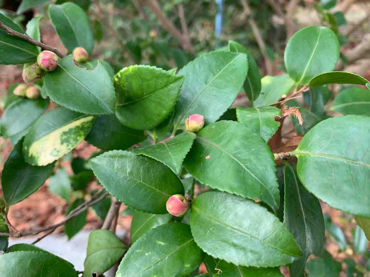 椿(つばき)は一般的には冬の花と言われていますが、やはり1月〜2月頃が花の盛りのようです。まだ、ほとんどがつぼみでした。