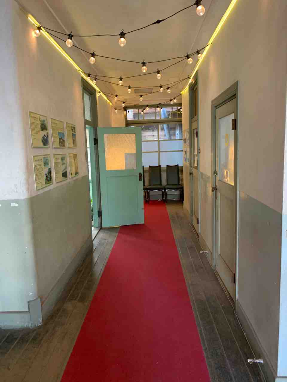 入口入ると正面に長い廊下。レトロな電球が飾らせています。