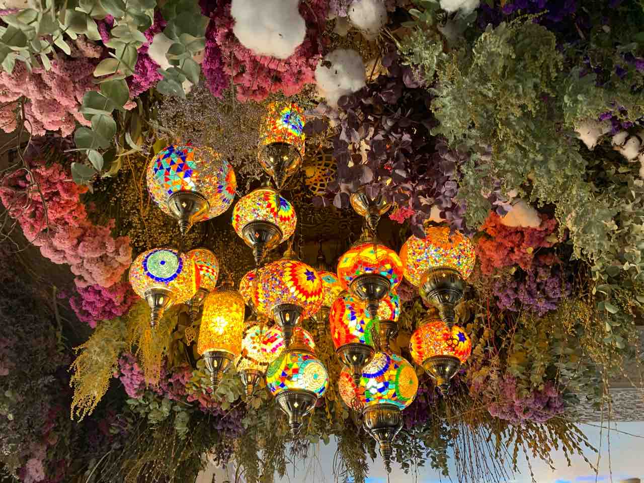 東ヨーロッパ・西アジア地域と思われる神秘的な雰囲気のランプとそのランプを囲むように配置されたドライフラワーに魅了されます。