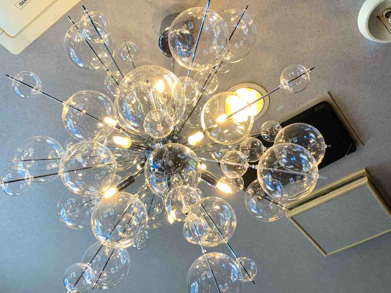 お洒落な「バブルシャンデリア」は店内をエレガントに見せてくれます。