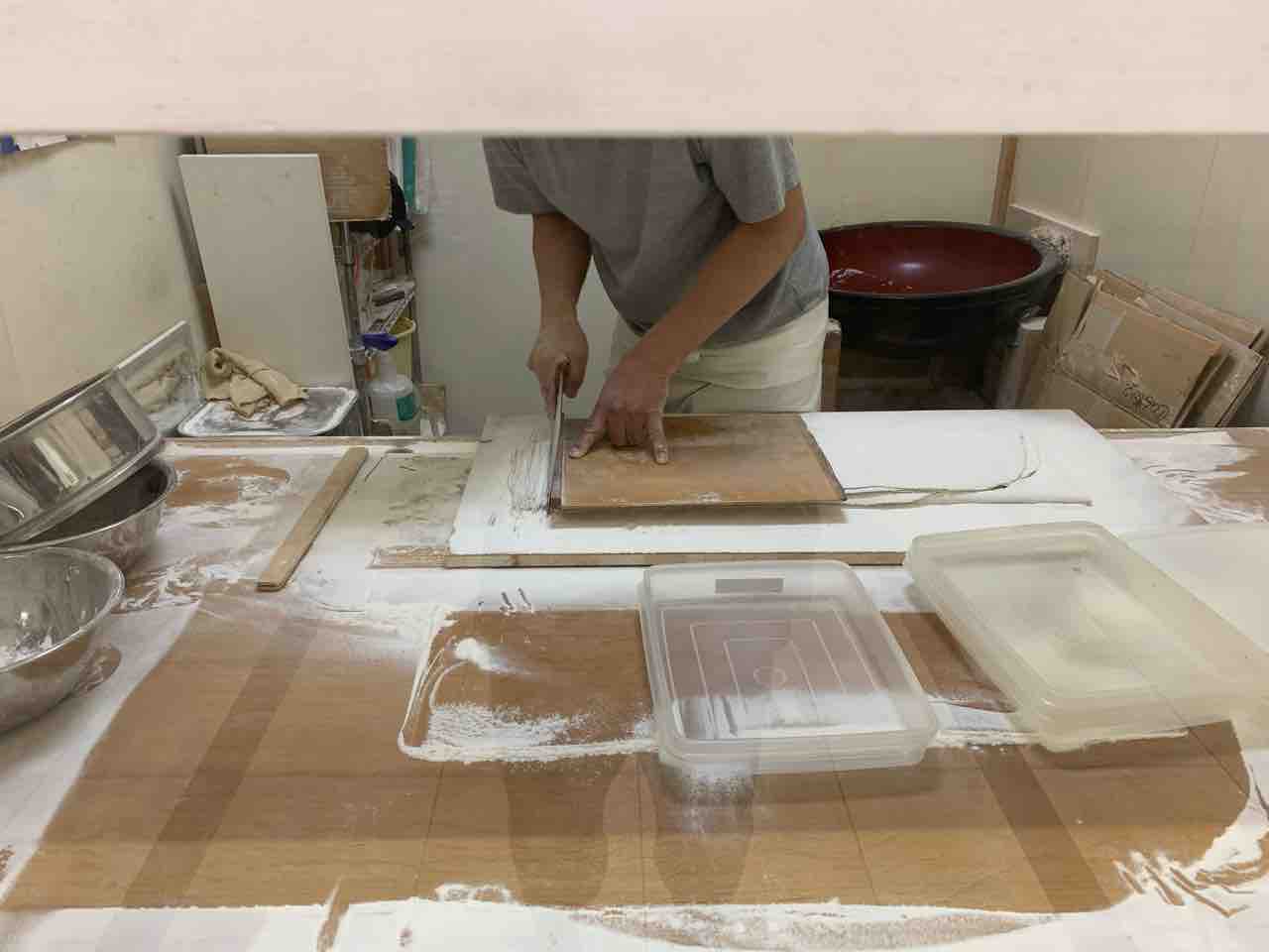 入口の右手では、オープン前に店長さんの蕎麦打ちを見ることができます。
