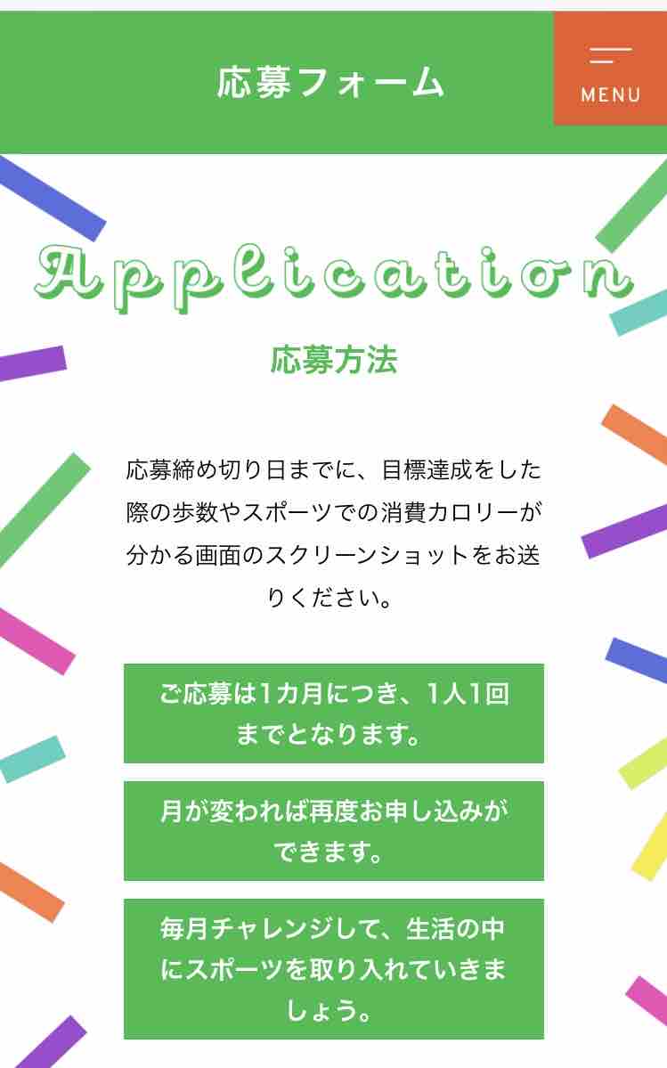 応募フォームは「気軽にスポーツ健康チャレンジ」【公式】を開いて、画面を下にスクロールすると、「ご応募はこちらから」が表示されます。クリックして下さい。