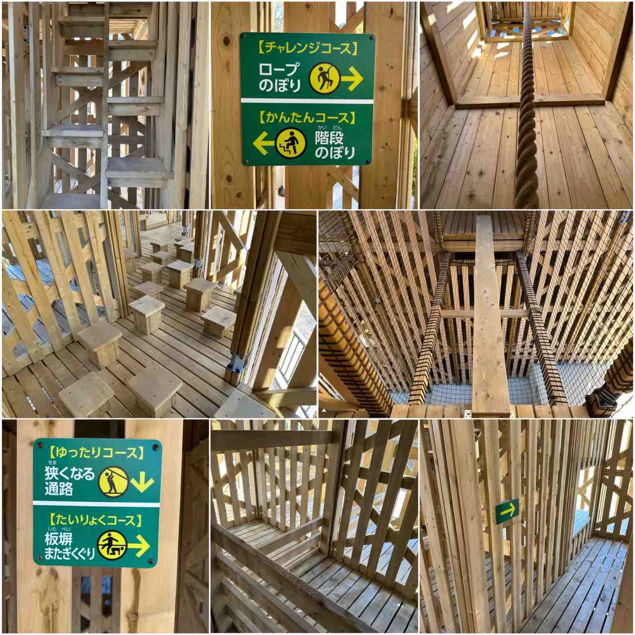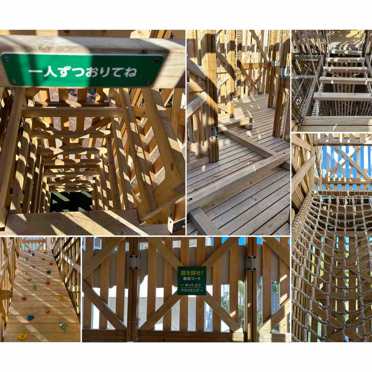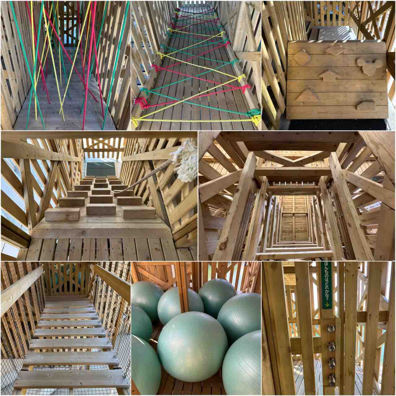 5層2棟の大型木製アスレチック。38種類のアスレチックに挑戦、クリアして「幸せの鐘」を鳴らそう。というものです。