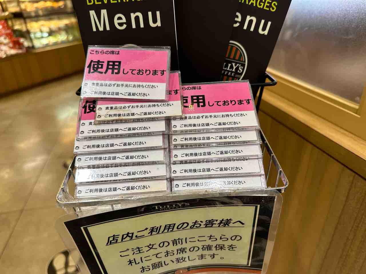 先に席の確保をしていたら安心してオーダーできます。自分の持ち物をテーブルに置いておくのは不用心。これなら安心ですね。