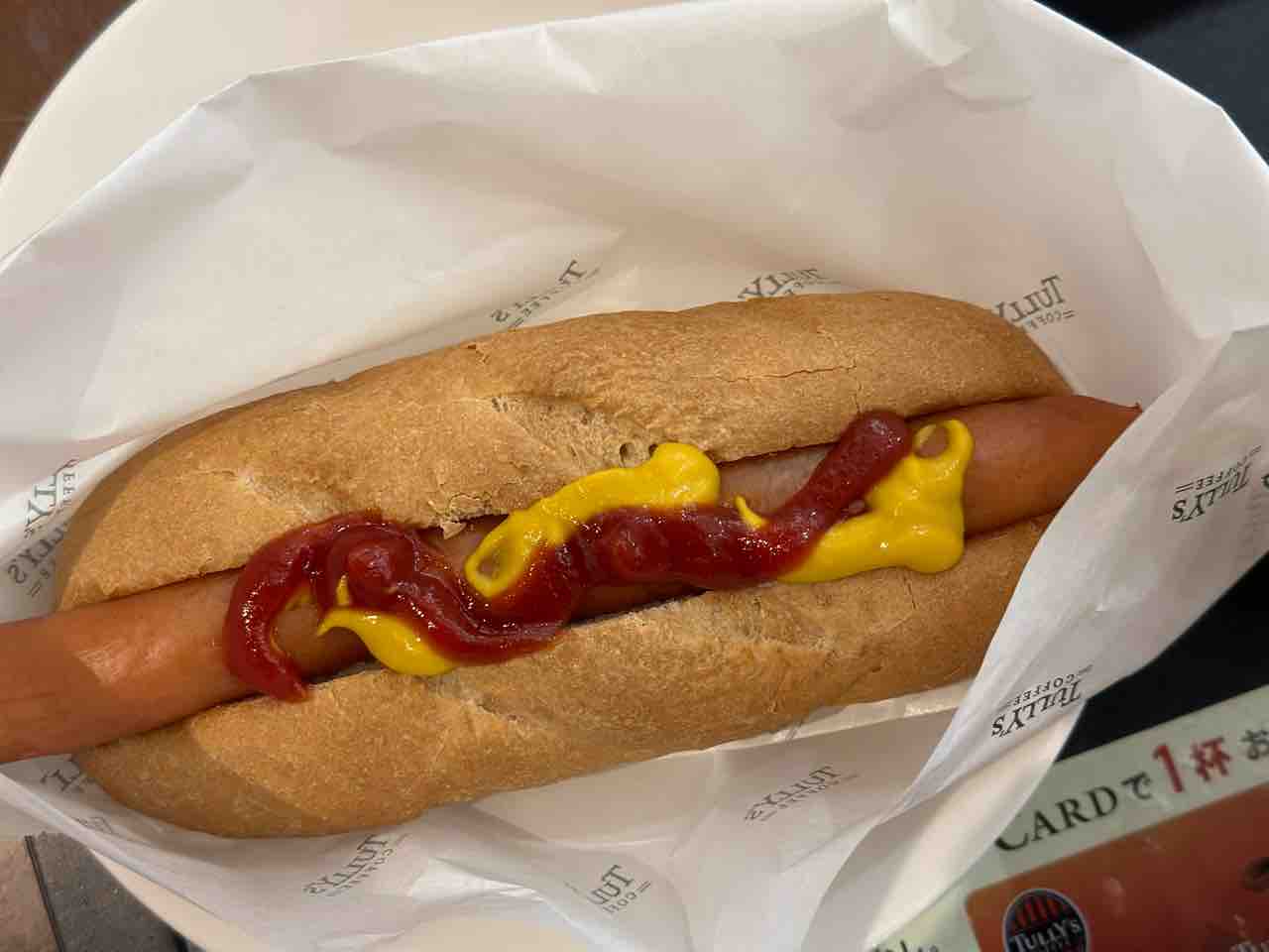 パンは香ばしく、ジューシーな粗挽きソーセージはパンからはみ出すぐらいの長さで食べ応えありました。