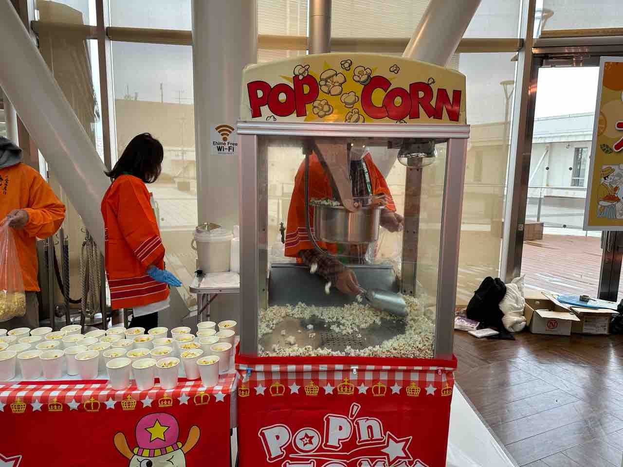 ポップコーン製造機。余りの人気で大忙しのようです。チラシの引換券でいただけます。