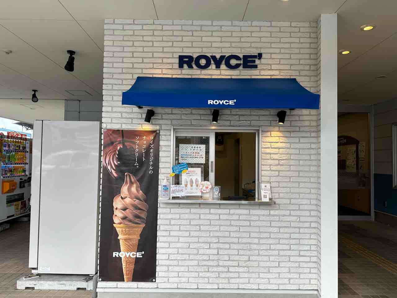 白っぽいレンガ模様の壁面にロイズのロゴ。濃紺の庇テントの下に小さな窓。可愛らしい売り場です。