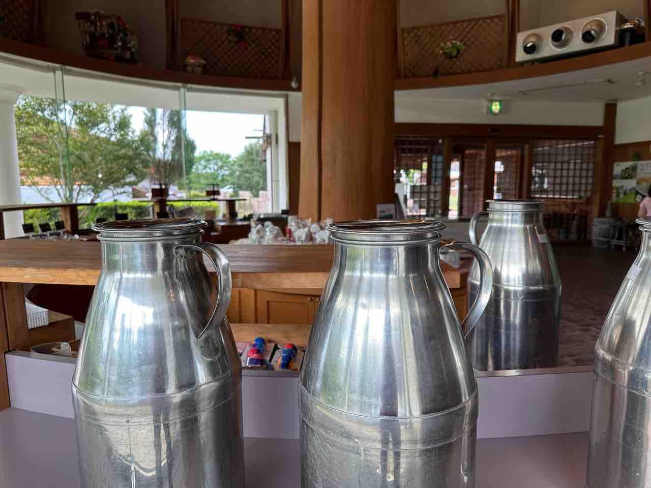 建物右手のサイロ風建物がお土産売り場。ミルク缶が置いてあって、ミルクの町をアピールしています。