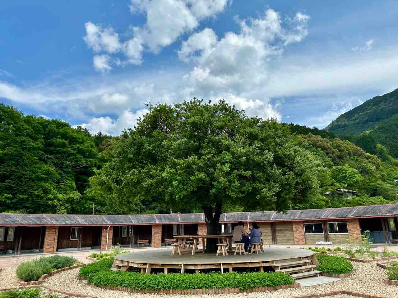 建物前にベンチがありますが、庭園中心にある木の下のベンチは特等席です。