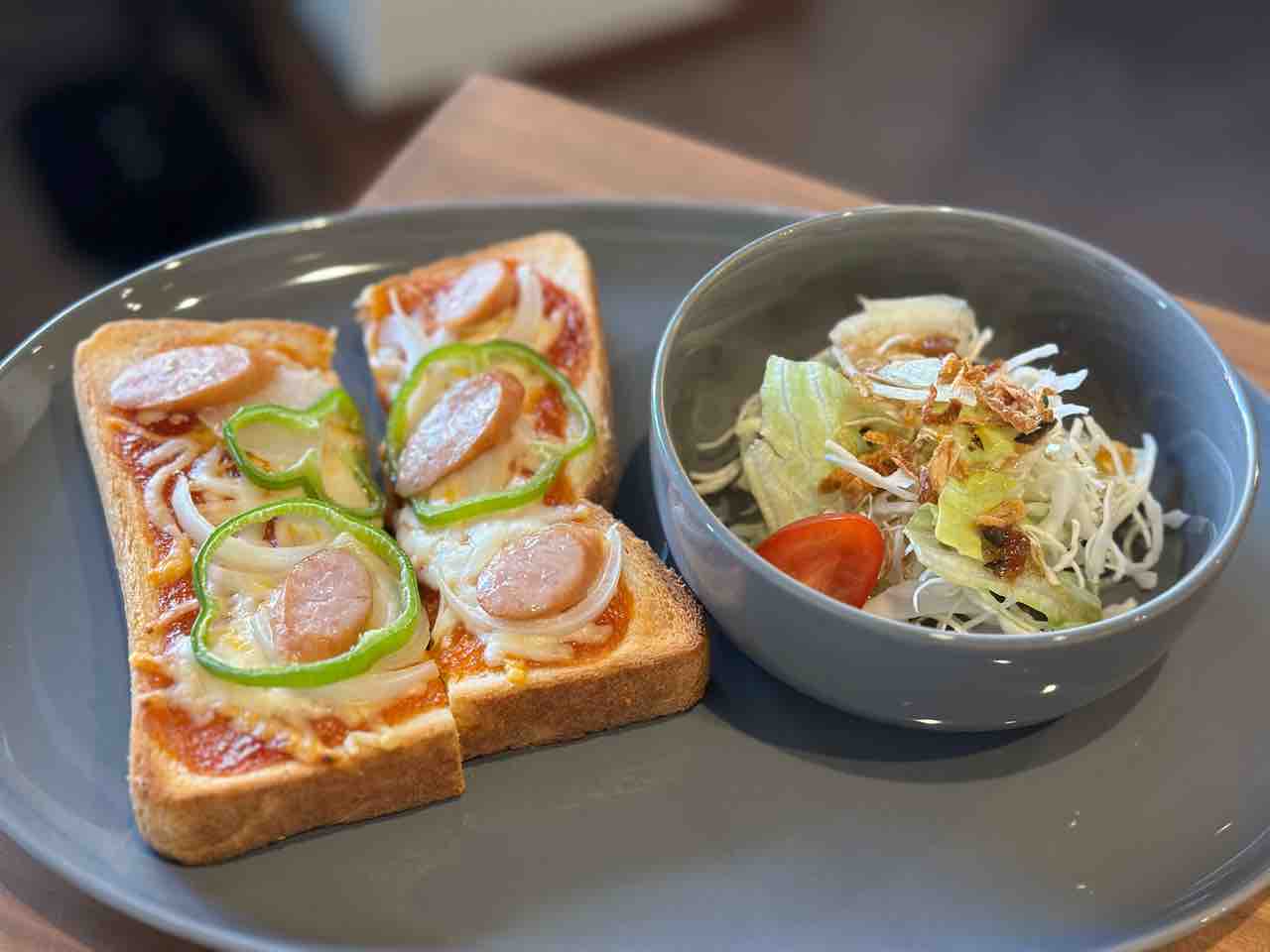 ピザトーストは、サクッとしたトーストの食感が心地よいです。トーストの上にはたっぷりのトマトソースが塗られていて、そのフレッシュな酸味と甘みが絶妙にマッチしていました。
