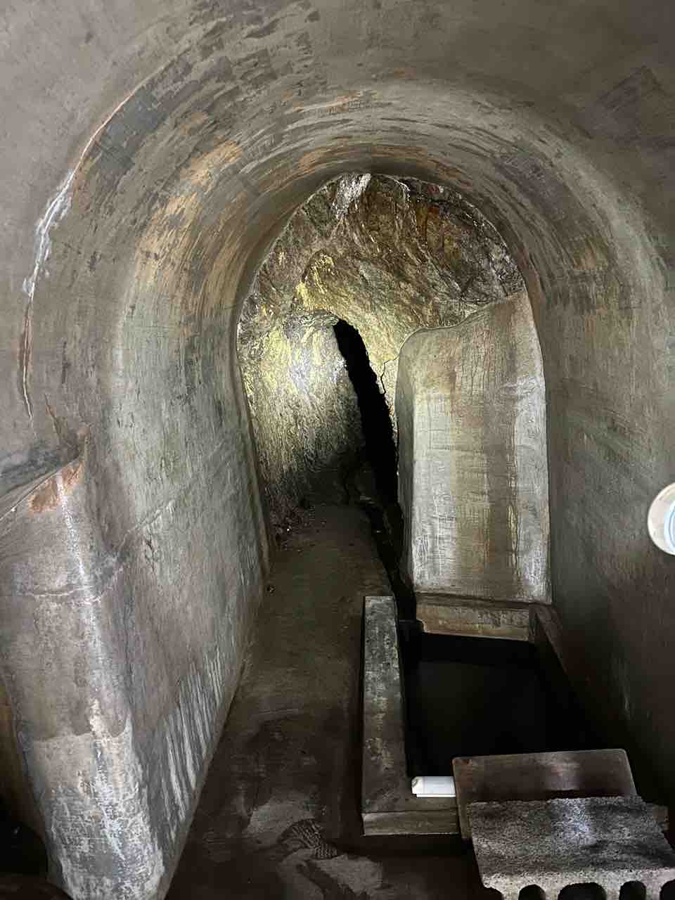 裏山の岩盤に50m以上掘られた横井戸に由来しています。