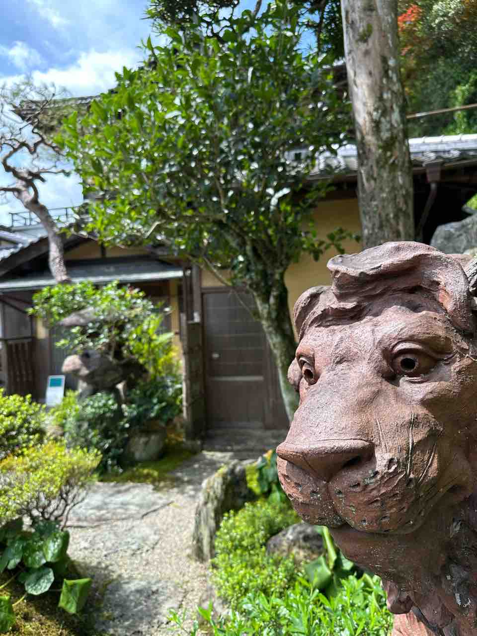 庭園は前庭と中庭の2箇所があります。いずれも銘石「伊予の青石」がふんだんに使われ、美しさに心を奪われます。前庭には訪問者を待つ立派なライオン像があり、その威厳ある姿が印象的です。