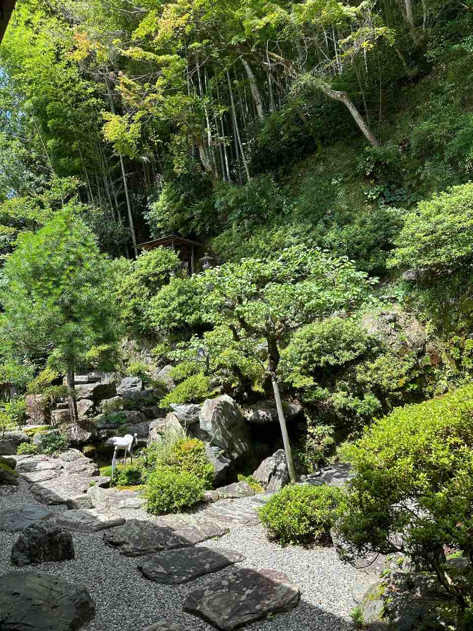 中庭には、縁起を担いで砥部焼の鶴や亀を模した石がおかれており、そのデザインが一層の魅力を引き立てています。