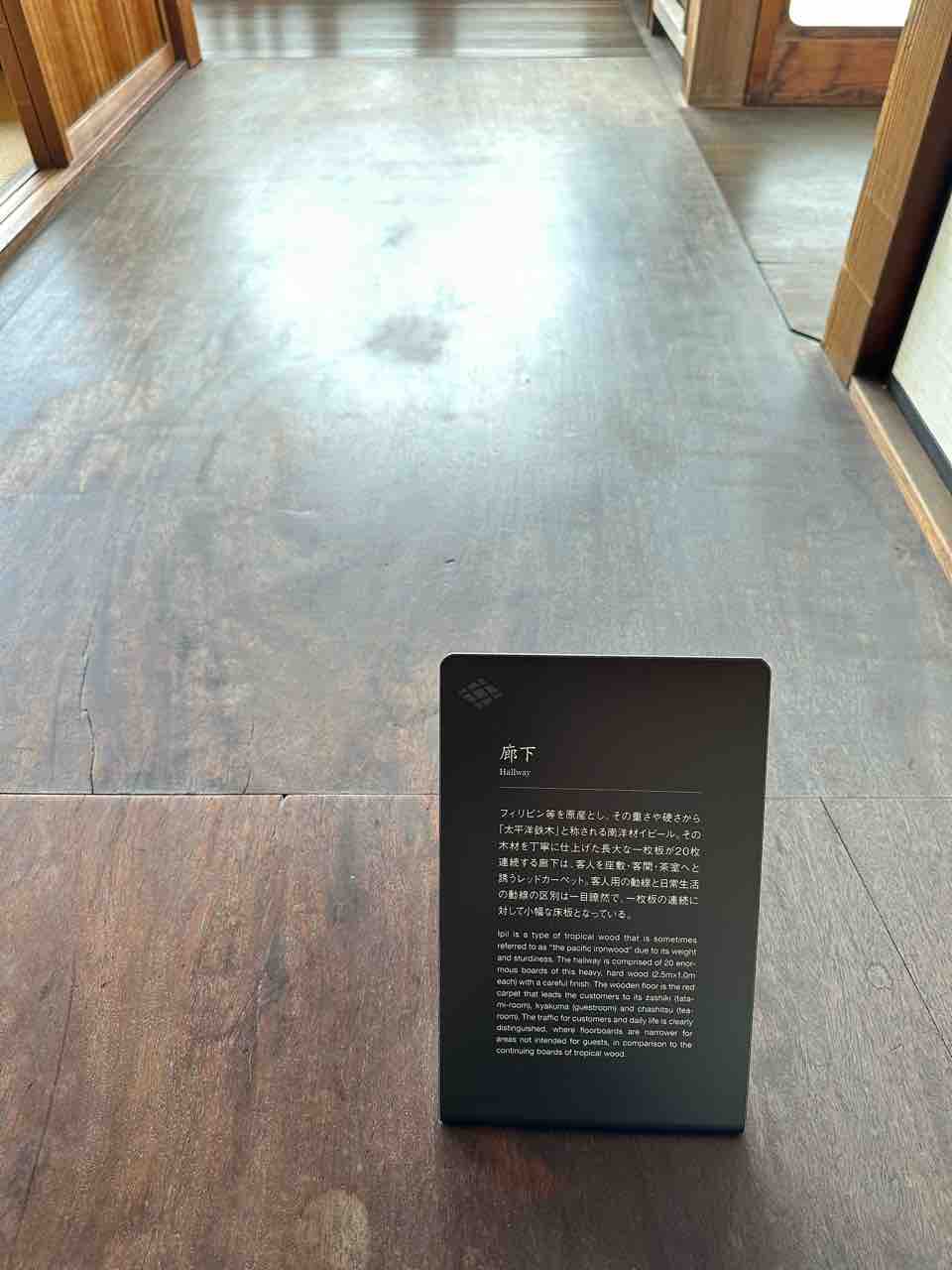 廊下にはフィリピン等を原作として、その重さや硬さから「太平洋鉄木」と称される南洋材イピール。その木材を丁寧に仕上げた長大な一枚板が20枚連続する廊下は、客人を座敷・客間・茶室へと誘うレッドカーペット。