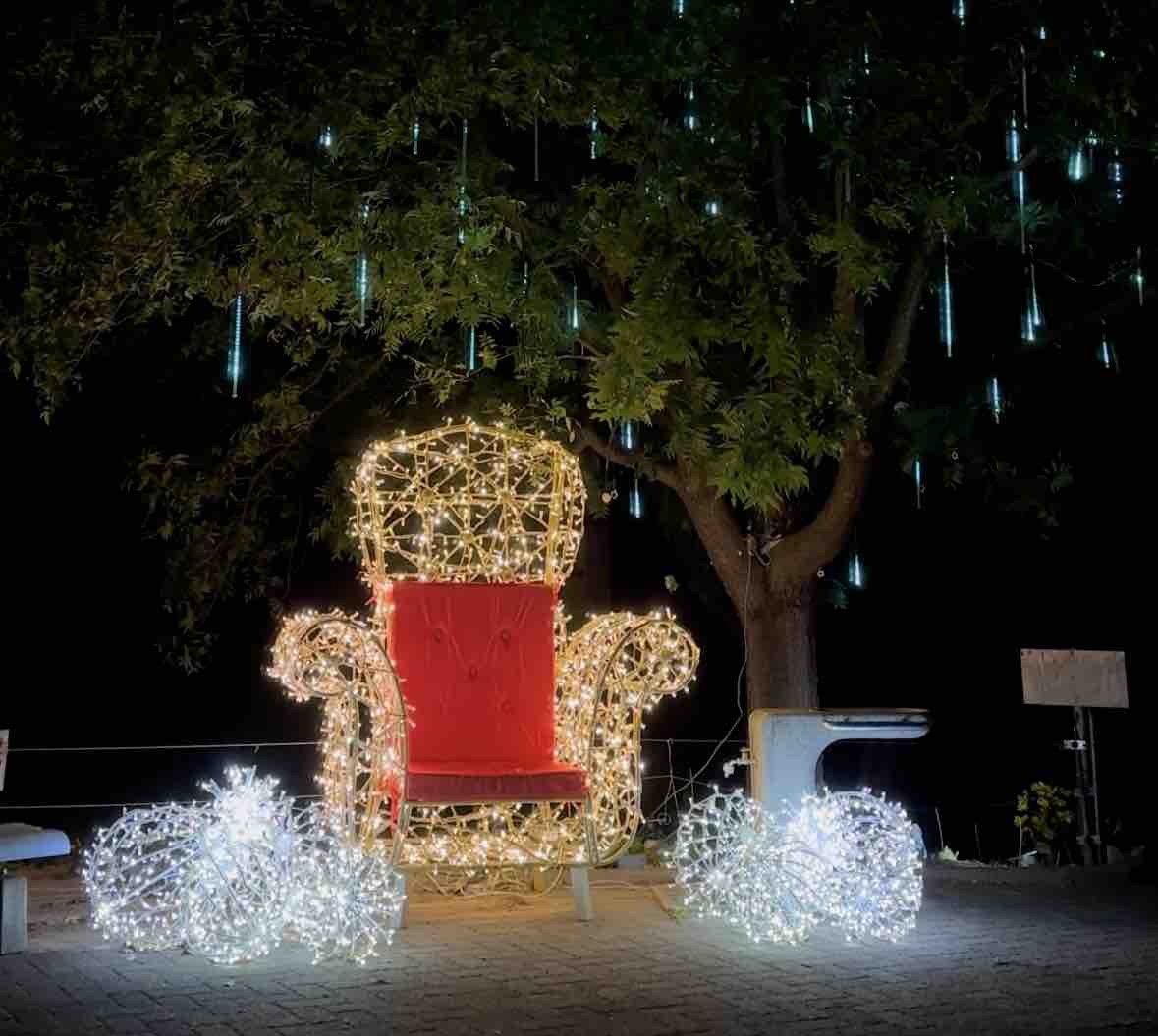 さらに、その上方にそびえる大樹からは、無数の光が星のように降り注ぎ、まるで夢の中に迷い込んだかのような感覚を味わえます。この場所は、ただ写真を撮るだけでなく、実際に椅子に座ってその幻想的な空間に浸ることで、より特別な体験ができるのが魅力。子どもから大人まで幅広い層に人気で、まさにフェスタ・ルーチェの象徴的スポットといえるでしょう。訪れた際には、ぜひ立ち寄ってみてください。