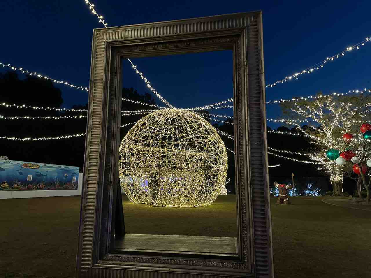 フォトスポットとして人気の光のアートフレーム。額縁越しに見えるのは、無数のLEDが織りなす美しい球体のイルミネーションです。フレームが絵画のように景色を切り取ることで、まるで一枚のアート作品を眺めているかのような感覚に。