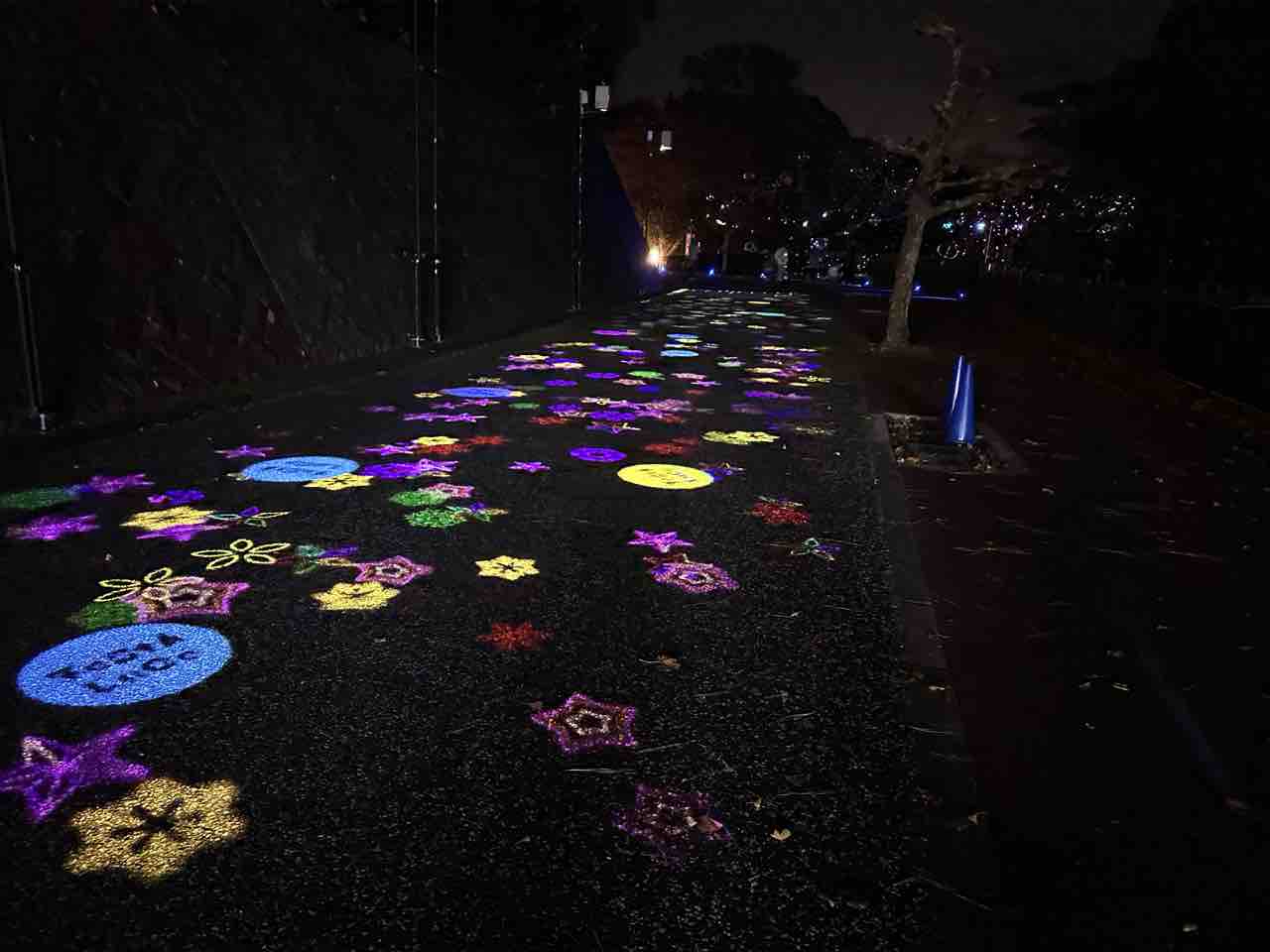 フェスタ・ルーチェ会場内で見つけられる「光で彩られた星の小道」。足元には無数のカラフルな星や花、さらには月や惑星をイメージさせる幻想的な光の模様が広がっています。