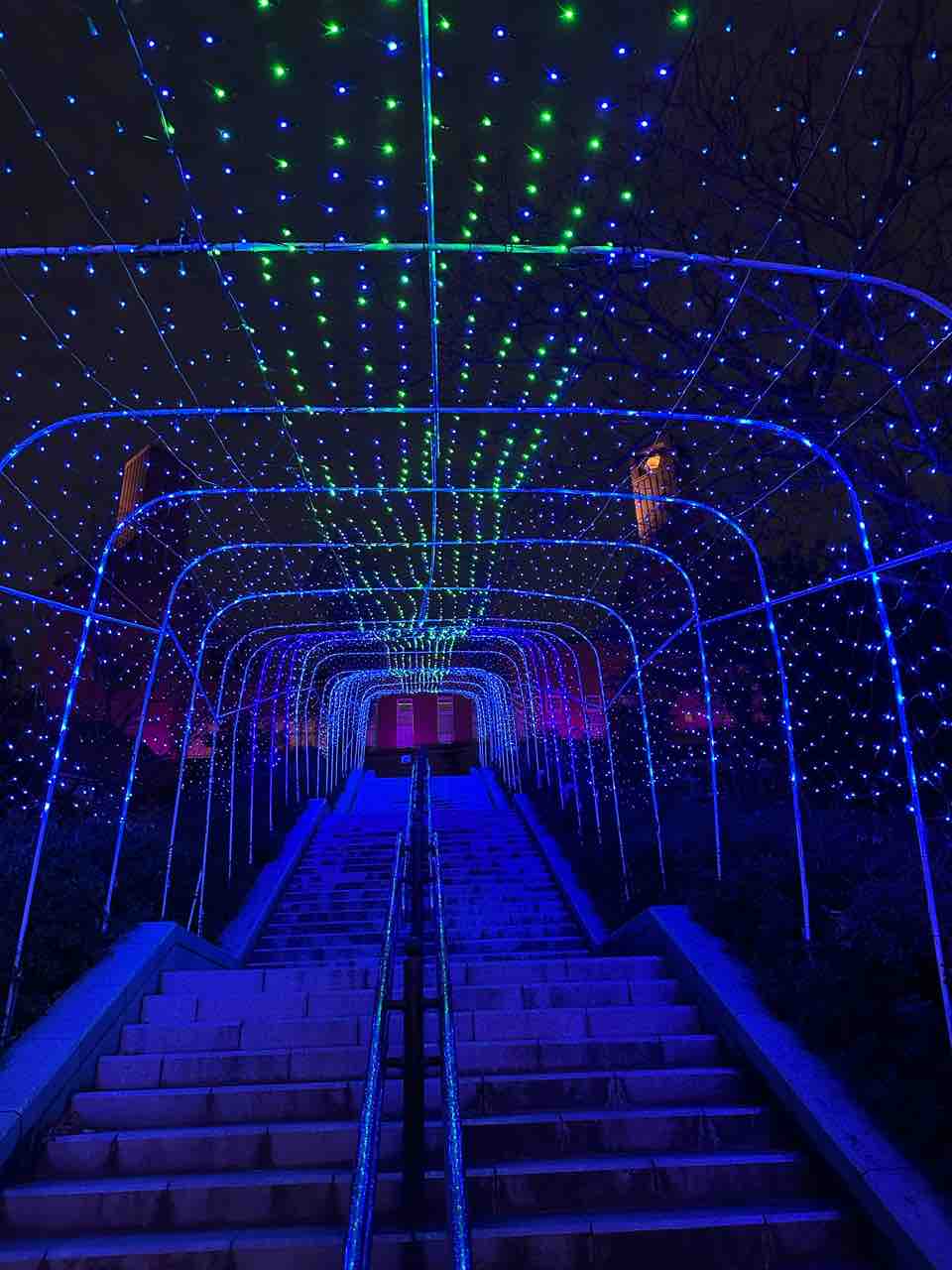 暖かみのある光が階段を包み込み、歩くたびにその先の景色が広がります。 道中には、ライトアップされた木々や光のオブジェが随所に設置されており、一歩進むごとに異なる世界が展開されていきます。