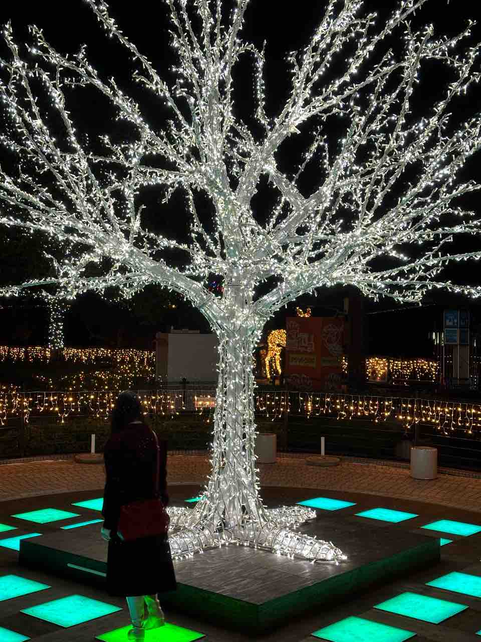 その美しさはもちろんですが、足元のライトに注目です。この四角いライトは、人が乗ると色が変化する仕掛けになっており、大人も子どもも思わず夢中になってしまいます。光の樹とともに、足元で繰り広げられるカラフルな光の演出。