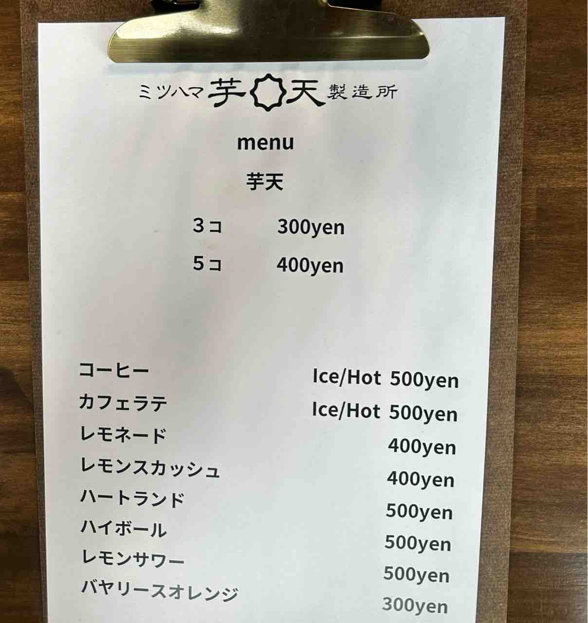 「ミツハマ芋天製造所」のメニューは、シンプルながら素材や味へのこだわりを感じられるラインナップです。