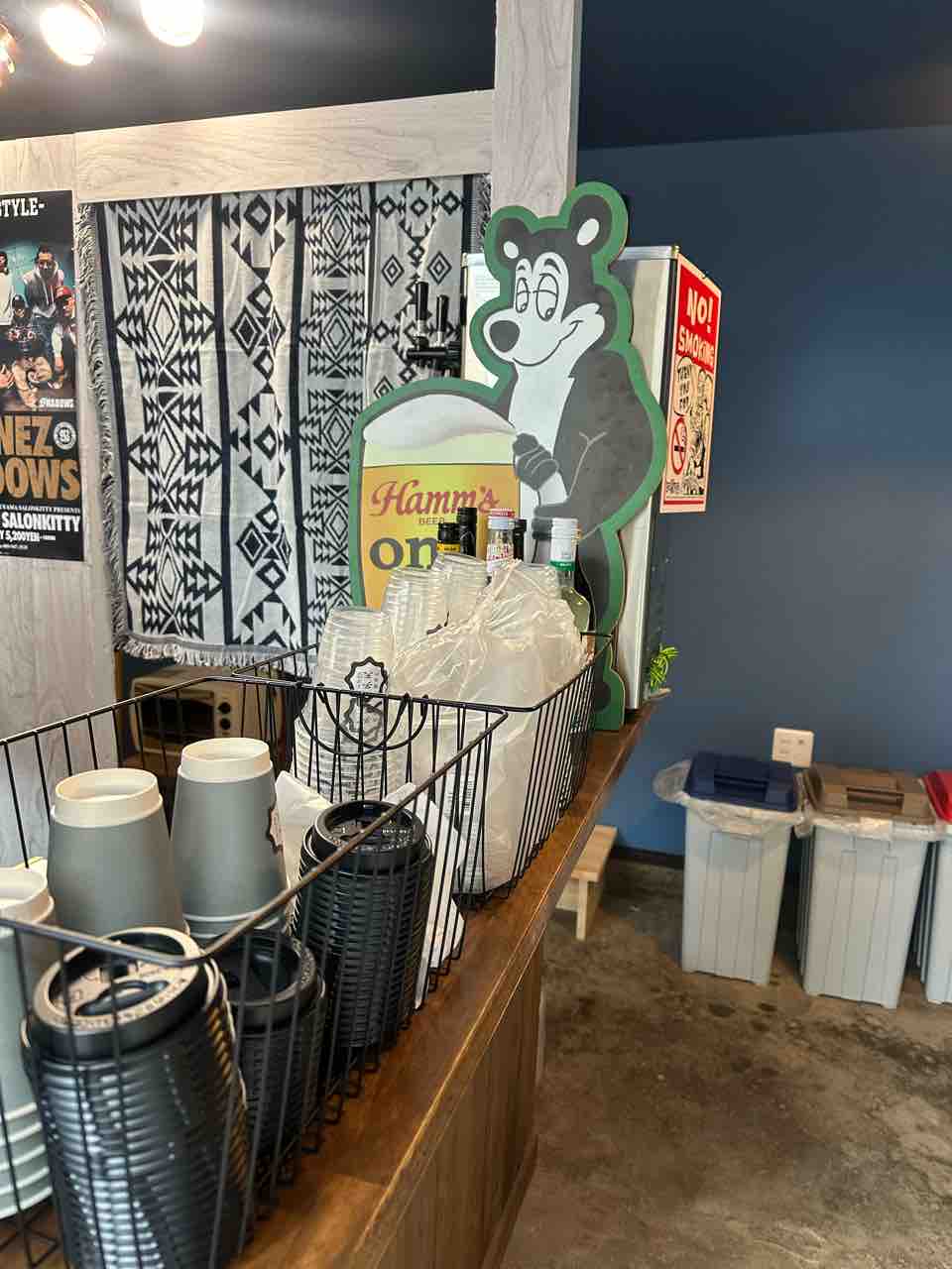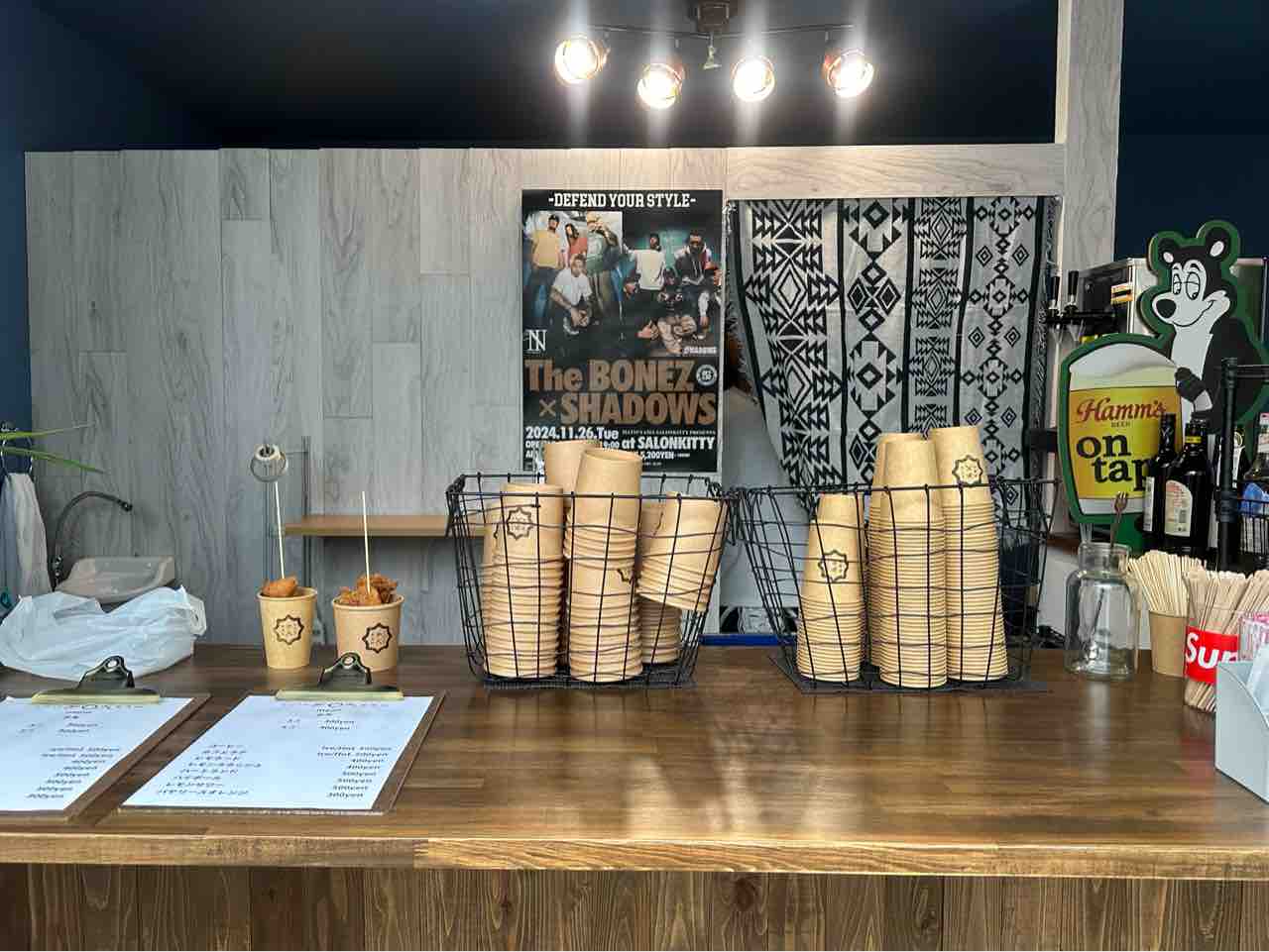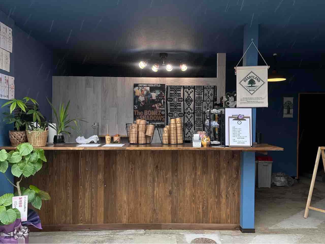 店舗正面には木目調の広々としたカウンターがあり、落ち着いた雰囲気を演出。店内はオープンな作りで、通りから中の様子がよく見えるため、気軽に立ち寄れるのが魅力的です。整然と並べられた紙カップや観葉植物がシンプルな中にもおしゃれなアクセントを加えています。