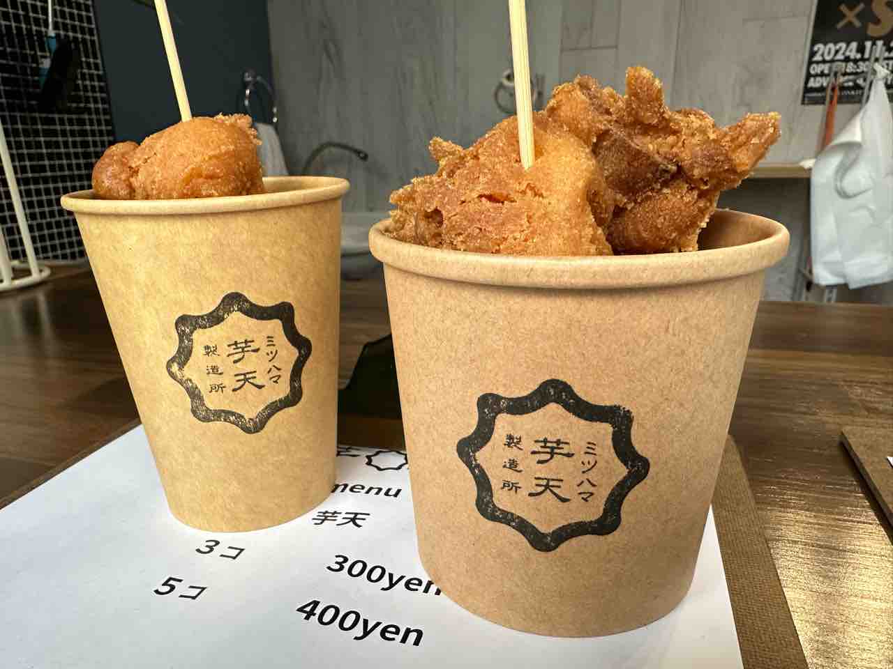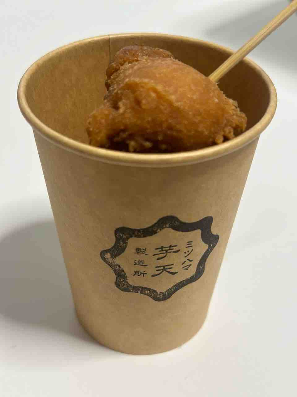 3個入りと5個入りのカップが選べ、その日の気分やお腹の空き具合に合わせて注文可能です。出来立てをその場で味わえば、外はカリッと香ばしく、中はホクホクの芋天にやみつきになること間違いありません。