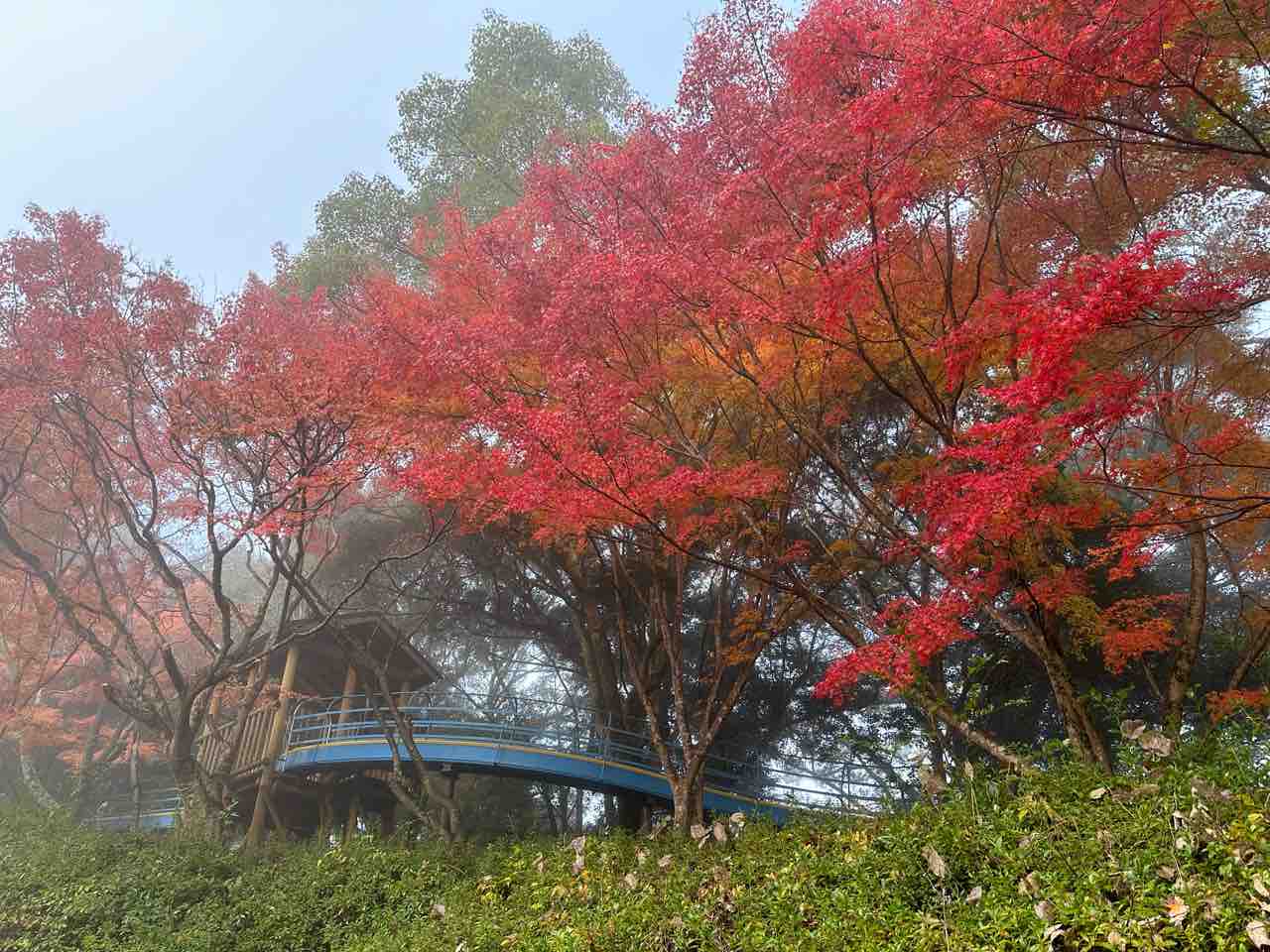 朝の霧が残る時間帯には、紅葉の深みが増し、どこか幻想的な雰囲気が広がります。「ローラー滑り台」や「展望台」が設置されているので、家族連れにも親しみやすいエリアとなっています。