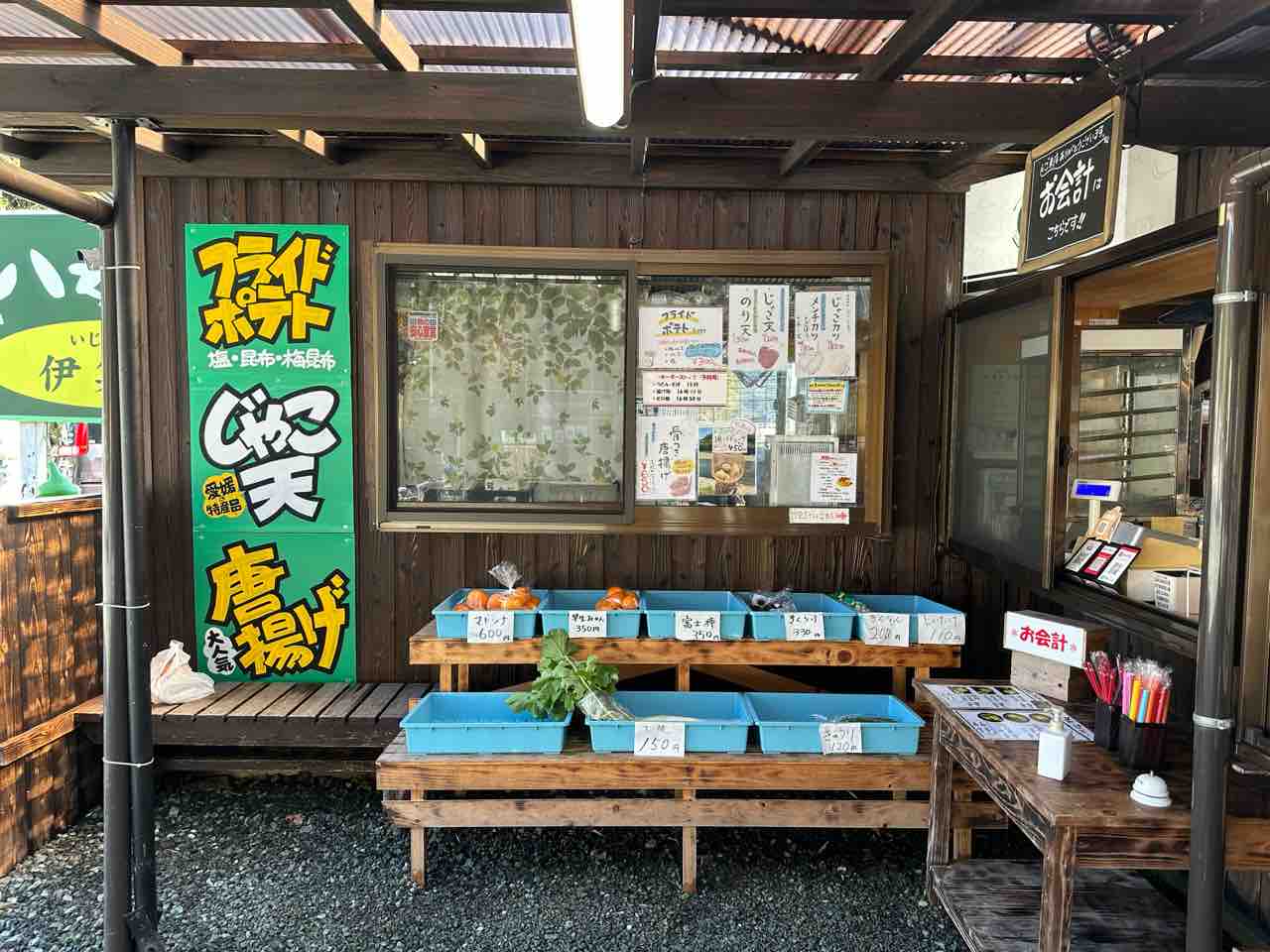 木の温もりを感じる落ち着いた店構えが特徴の1店舗目。地元産の新鮮な野菜や果物に加え、じゃこ天、唐揚げ、フライドポテト といった軽食が販売されています。