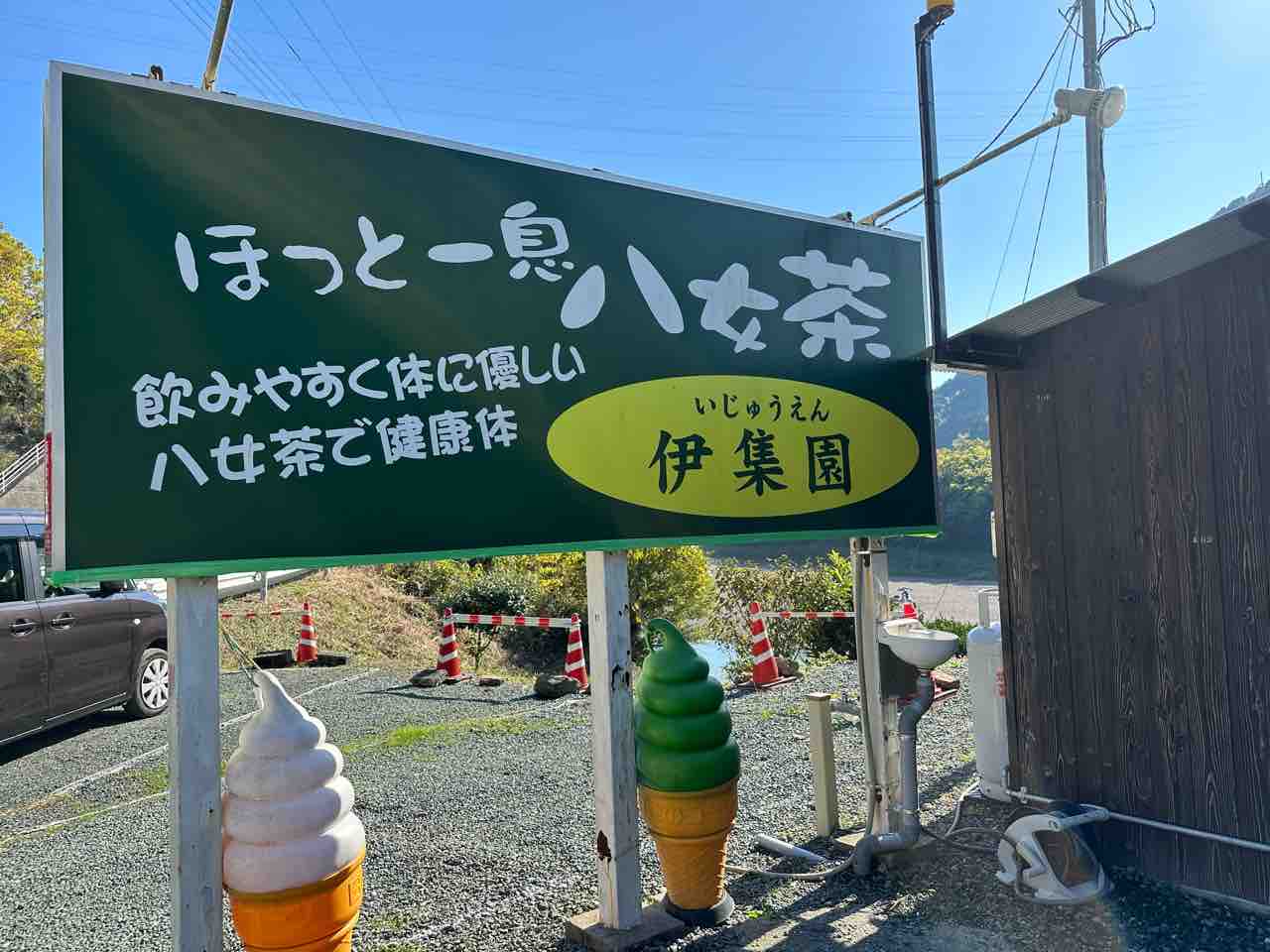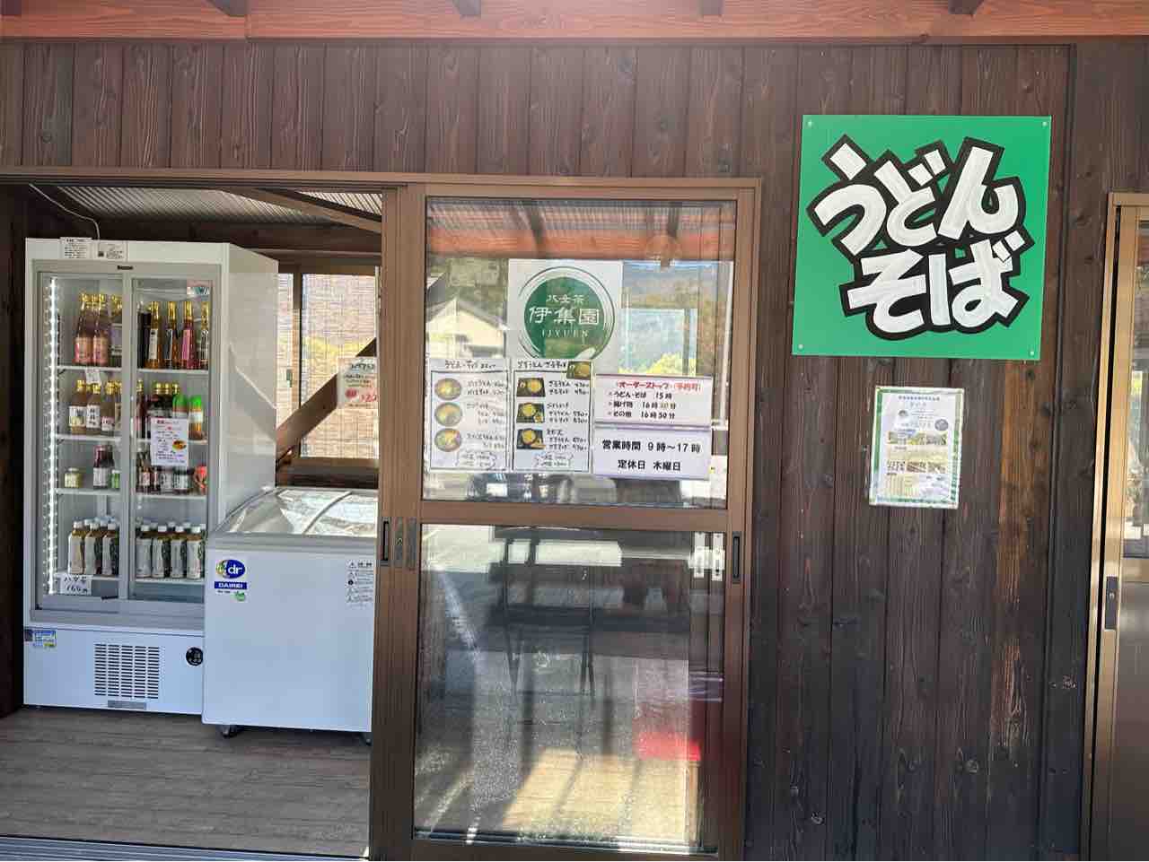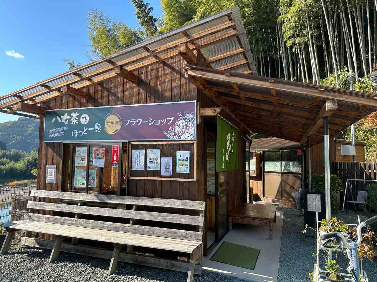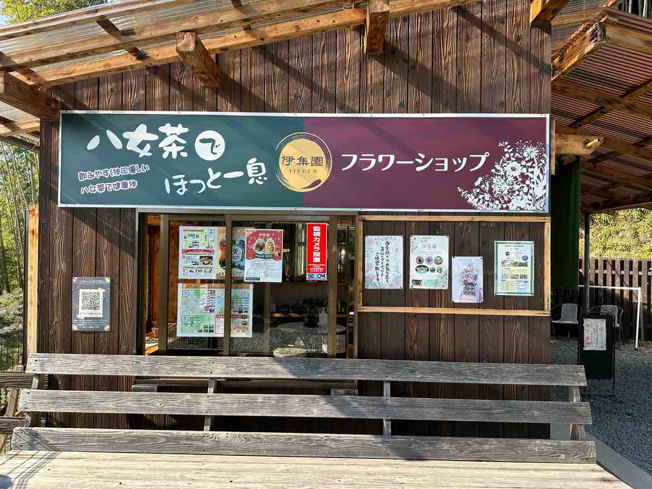 右手の店舗も木の温かみを感じさせるデザインで、入り口近くには「八女茶でほっと一息」と書かれた看板が訪れる人を迎えます。