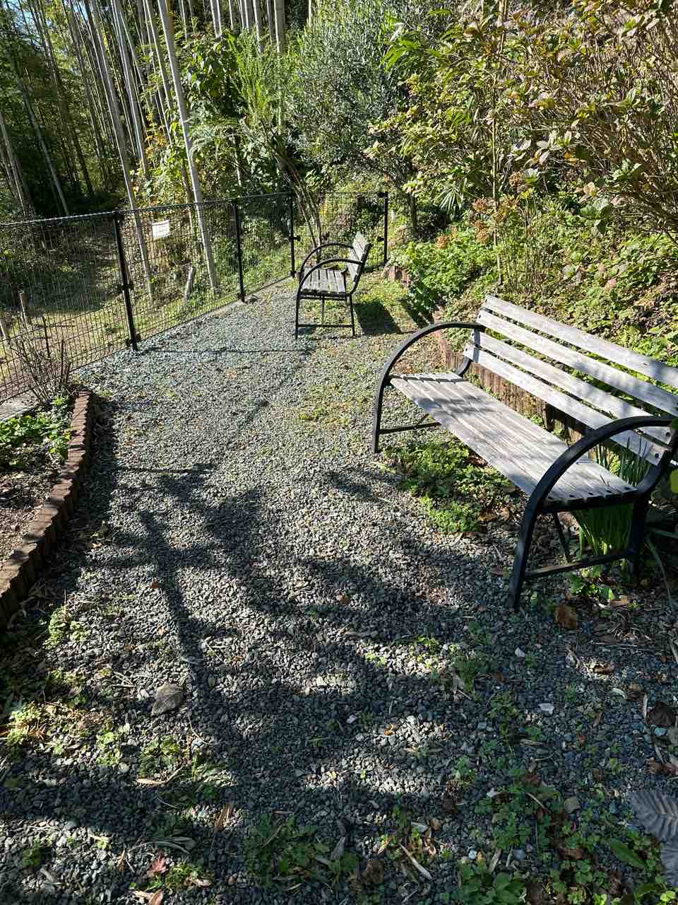 軒下にはベンチが設置されており、少し腰を下ろして一息ついたり、記念写真を撮影するのにもぴったりです。背後に広がる竹林が、さらに自然豊かな雰囲気を引き立てています。