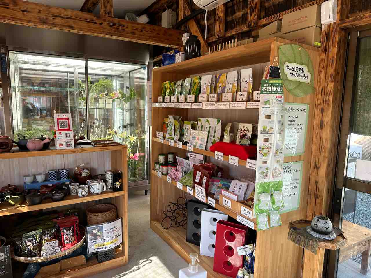店内に入ると、八女茶がずらりと並ぶ棚が目に飛び込んできます。手前には茶器や大豆スイーツも取り揃えられ、お茶を愛する方への贈り物にも最適です。