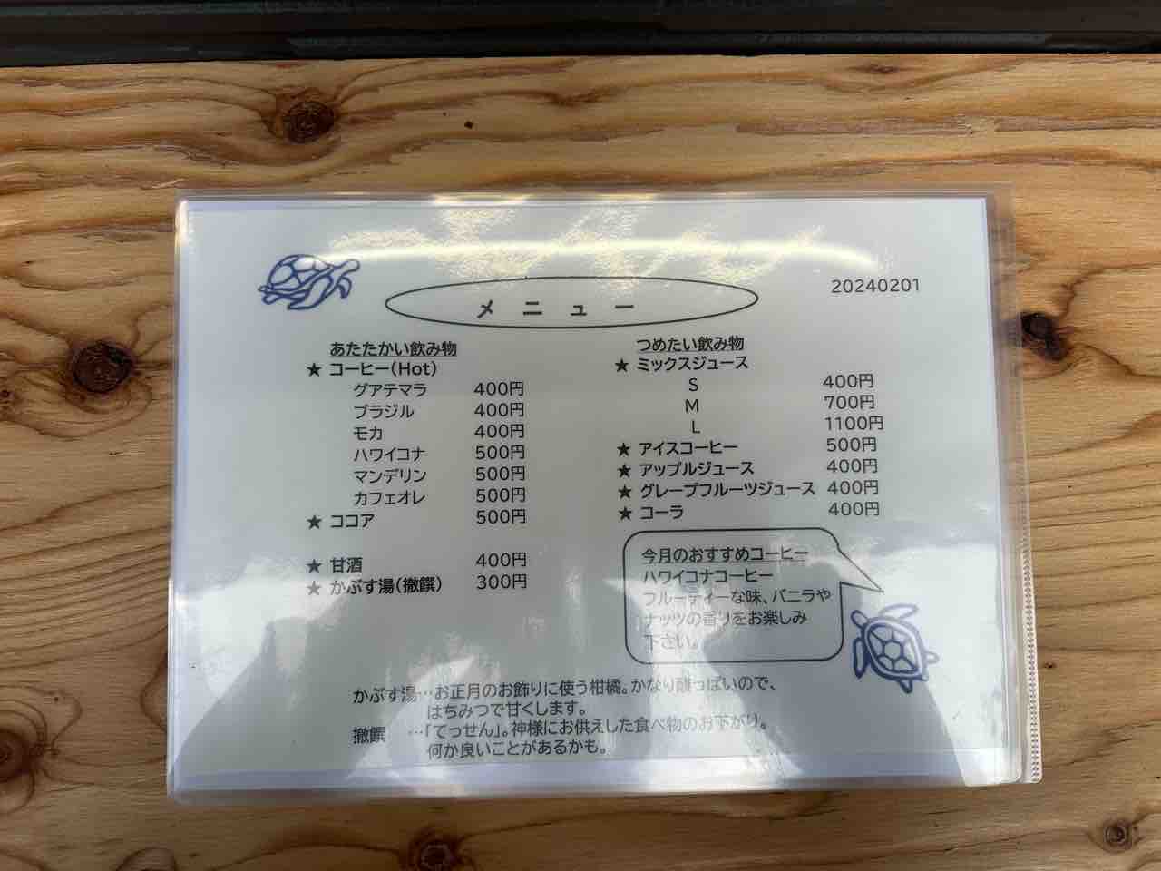 「水平線」では、厳選されたコーヒーを中心に、ホットドリンクや冷たいドリンクのほか、神社ならではの特別なメニューも提供されています。