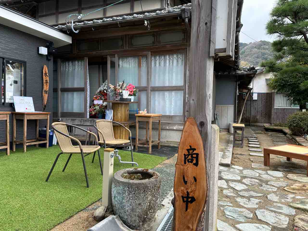 神社の石段を上る途中、二重門の隣に位置する「水平線」。黒を基調としたシンプルで洗練された外観が特徴で、木製の看板に「水平線」と書かれたロゴが温かみを添えています。