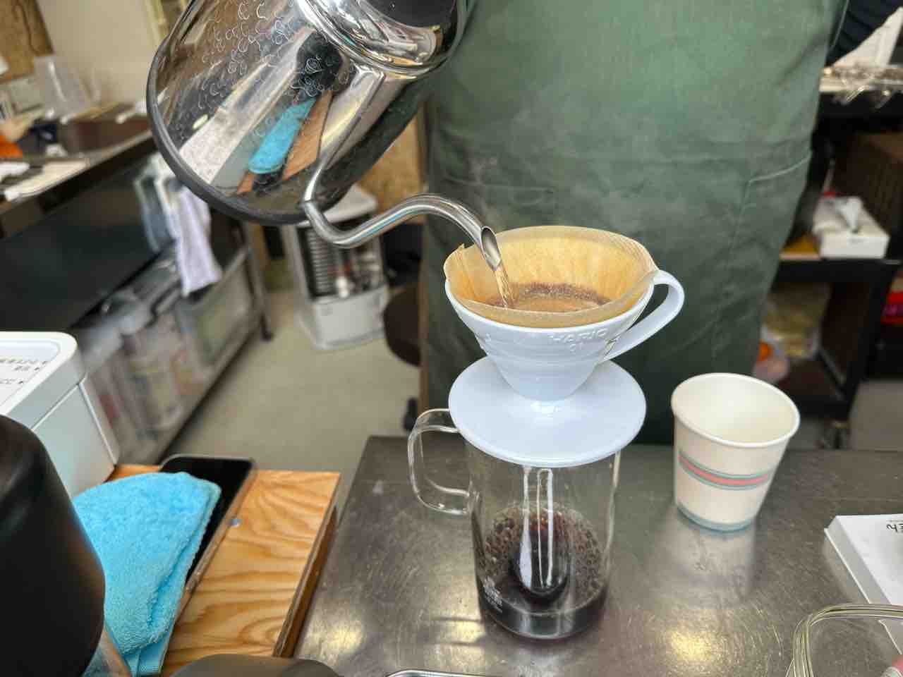 お茶請けには羊羹と手作りの干柿が添えられていました。干柿の自然な甘みがぎゅっと凝縮され、噛むたびに優しい甘さがじんわりと広がります。ねっとりとした食感が、コーヒーの酸味やコクと調和し、互いの味を引き立て合う絶妙なペアリングとなっています。