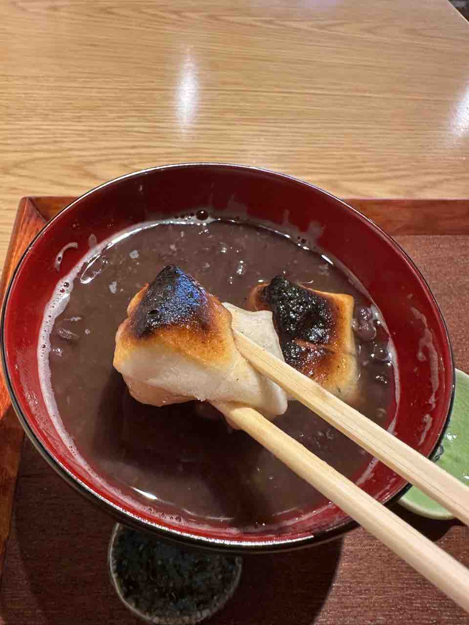 北海道産の小豆を丁寧に煮込み、甘さ控えめに仕上げたぜんざいは、小豆の風味がしっかりと感じられる上品な味わい。焼き色がついたお餅は、外は香ばしく、中は柔らかく伸びるもちもち食感で、小豆との相性も抜群です。