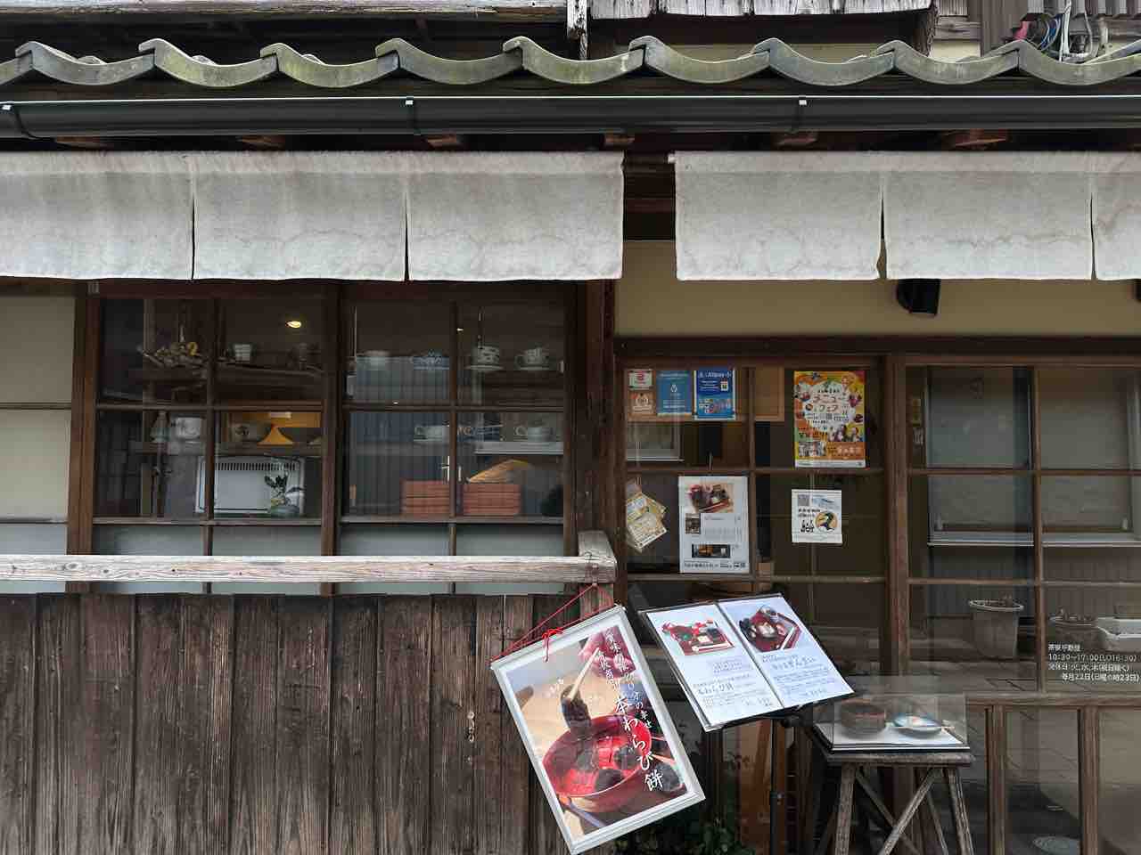 白い暖簾が静かに揺れる入り口には、手書きの看板が添えられ、和の趣を演出。格子戸からのぞく店内は、温かみのある空間が広がっていることを感じさせます。店先にはメニューの案内が掲示されており、特に名物の「本わらび餅」の写真が目を引きます。