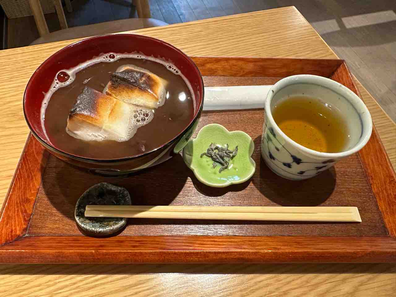 添えられた ほうじ茶 は、ぜんざいの甘さをすっきりと引き締めてくれる絶妙な組み合わせ。さらに、塩昆布がアクセントになり、甘さとのバランスを整えてくれます。落ち着いた和の空間で味わうぜんざいは、心も体も温まる贅沢なひとときでした。