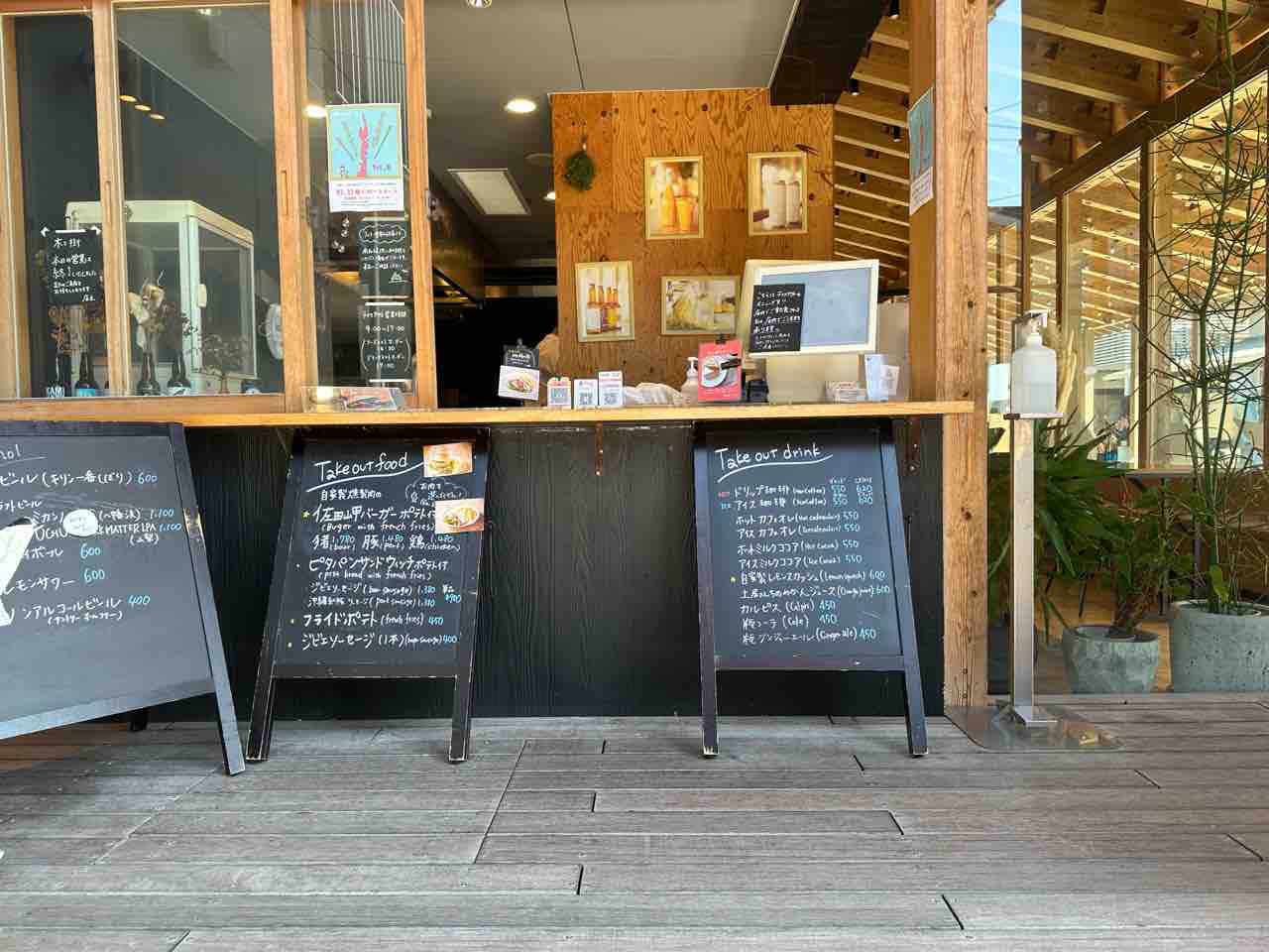 店頭にはテイクアウト用のカウンターがあり、外から気軽に注文できるスタイルになっています。窓口周辺には黒板メニューが掲げられており、提供されるフードやドリンクの種類を確認しやすいのが特徴です。また、壁にはカフェの雰囲気に合うアート作品や写真が飾られており、細部にまでこだわりが感じられます。