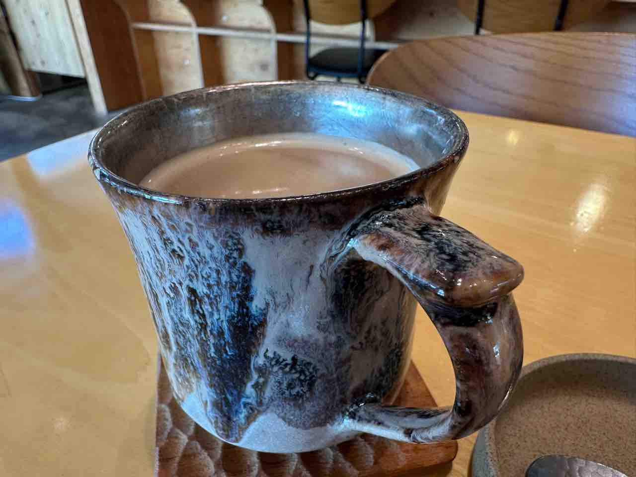カフェオレは、大きめの陶器のマグカップにたっぷりと注がれ、見た目にも温かみを感じさせます。ひと口飲むと、コーヒーのほろ苦さとミルクのまろやかさがほどよく調和し、優しい口当たりが広がります。 ミルクの甘みがほんのりと感じられる一方で、コーヒーのコクもしっかりと主張。冷めても美味しさが持続するのが印象的でした。