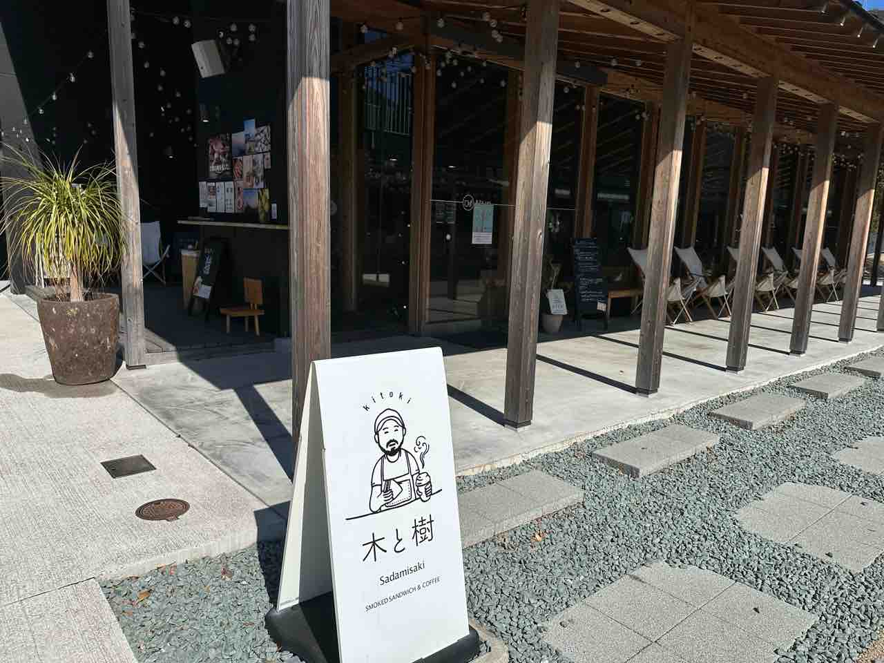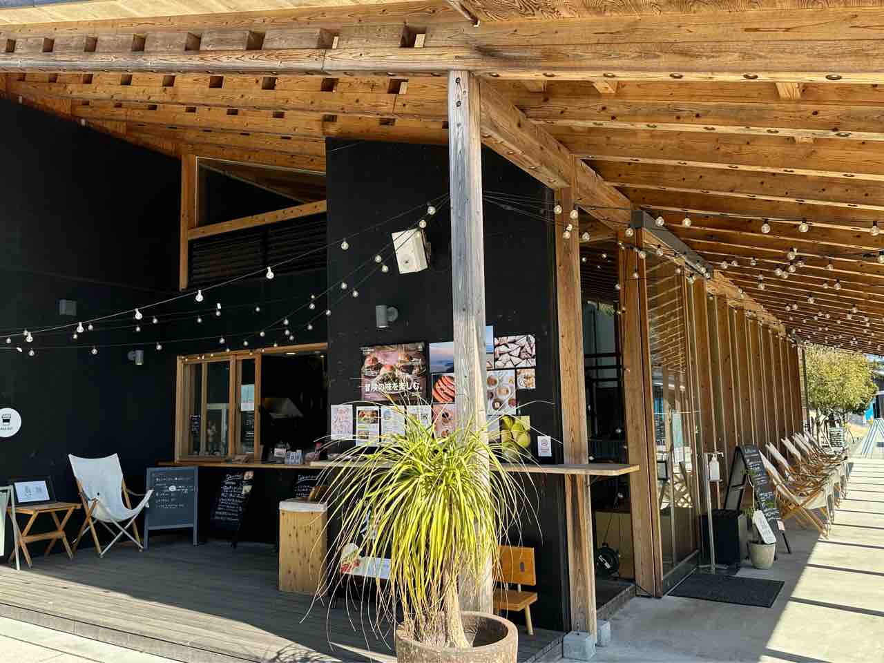 「木と樹」は「佐田岬半島」三崎港にある観光施設「みなとオアシス佐田岬はなはな」内に位置するカフェです。黒を基調とした壁面とナチュラルな木材のコントラストが美しく、モダンでありながら自然に溶け込むような雰囲気を醸し出しています。建物の広々とした屋根の下には開放的なテラス席が並び、ゆったりとした時間を過ごせる空間が広がっています。