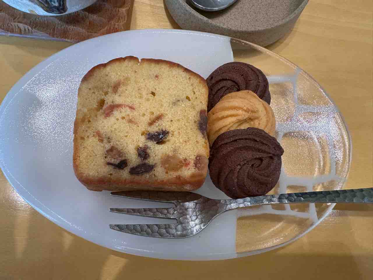 添えられたクッキーはサクサクとした食感で、プレーンとココアの2種類の風味が楽しめるのも嬉しいポイント。ゆっくりと味わうことで、焼き菓子の魅力を存分に堪能できる一皿でした。