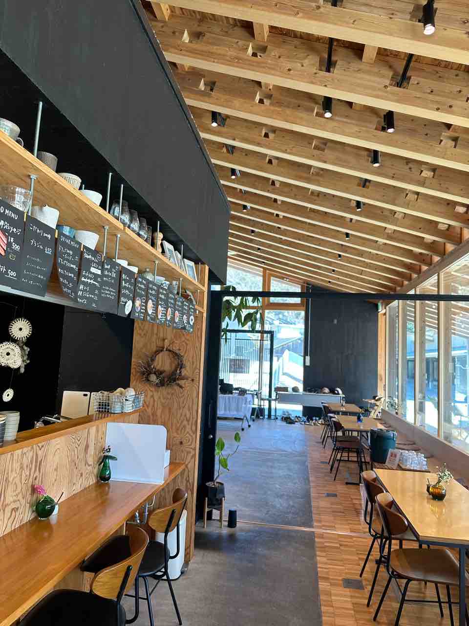 「木と樹」の店内は、木の温もりを感じる落ち着いた空間です。天井には無垢材の梁が並び、開放感のあるガラス窓からはたっぷりと自然光が差し込みます。テーブル席やカウンター席が配置され、どこに座っても心地よい雰囲気を楽しめます。