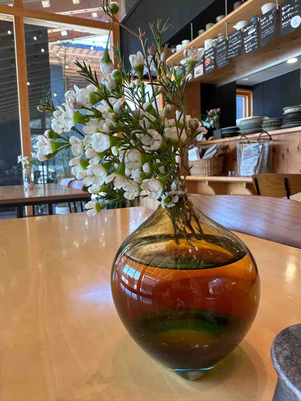 テーブルには、生花が飾られたガラスの花瓶が置かれ、店内のアクセントになっています。こうした細やかな心配りが、カフェ全体の居心地の良さにつながっていると感じました。