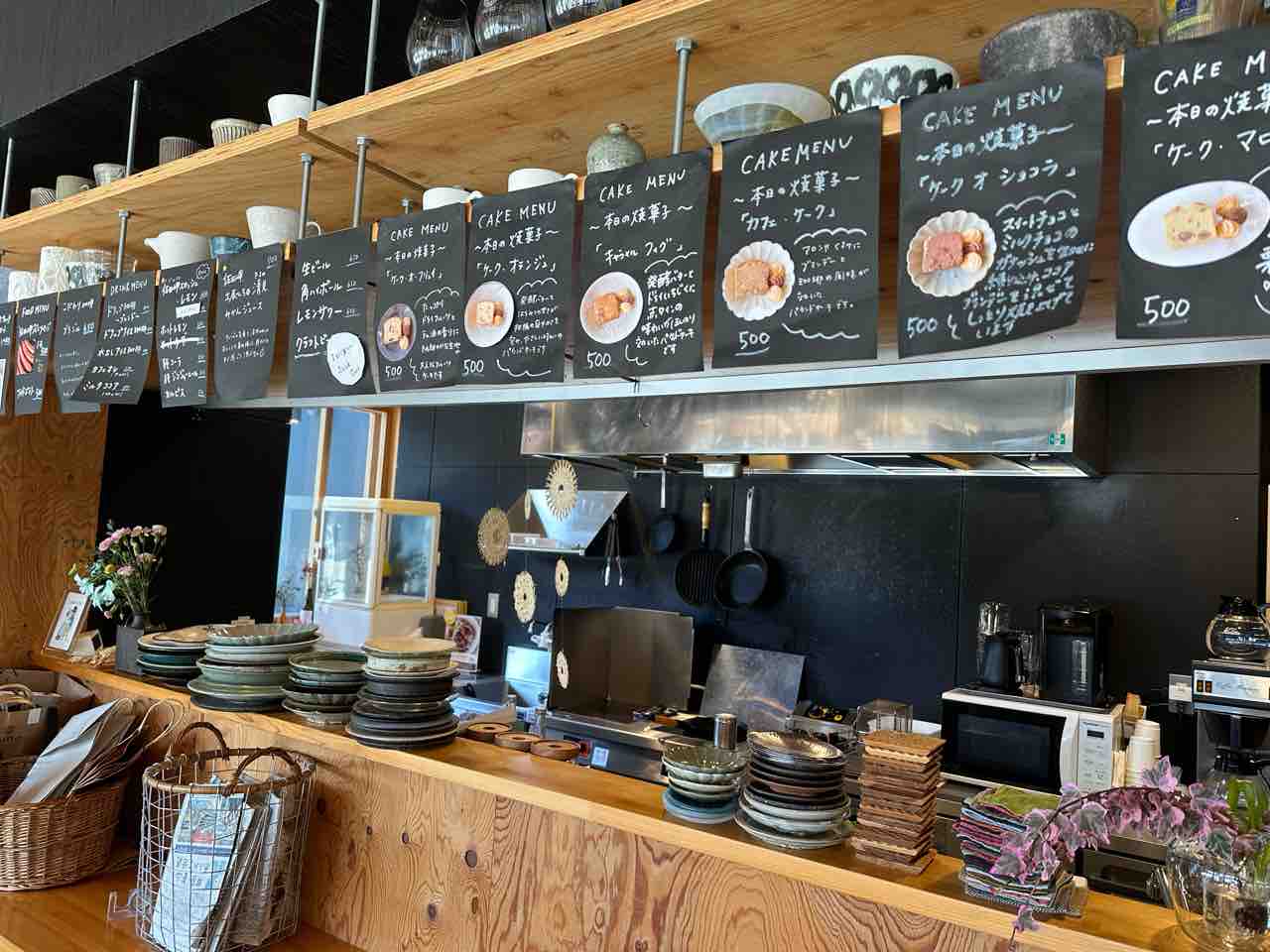 カウンター上部には、手書きのメニューが並び、ドリンクやスイーツのラインナップが一目で分かるようになっています。焼き菓子の種類も豊富で、訪れるたびに違った味わいが楽しめそうです。