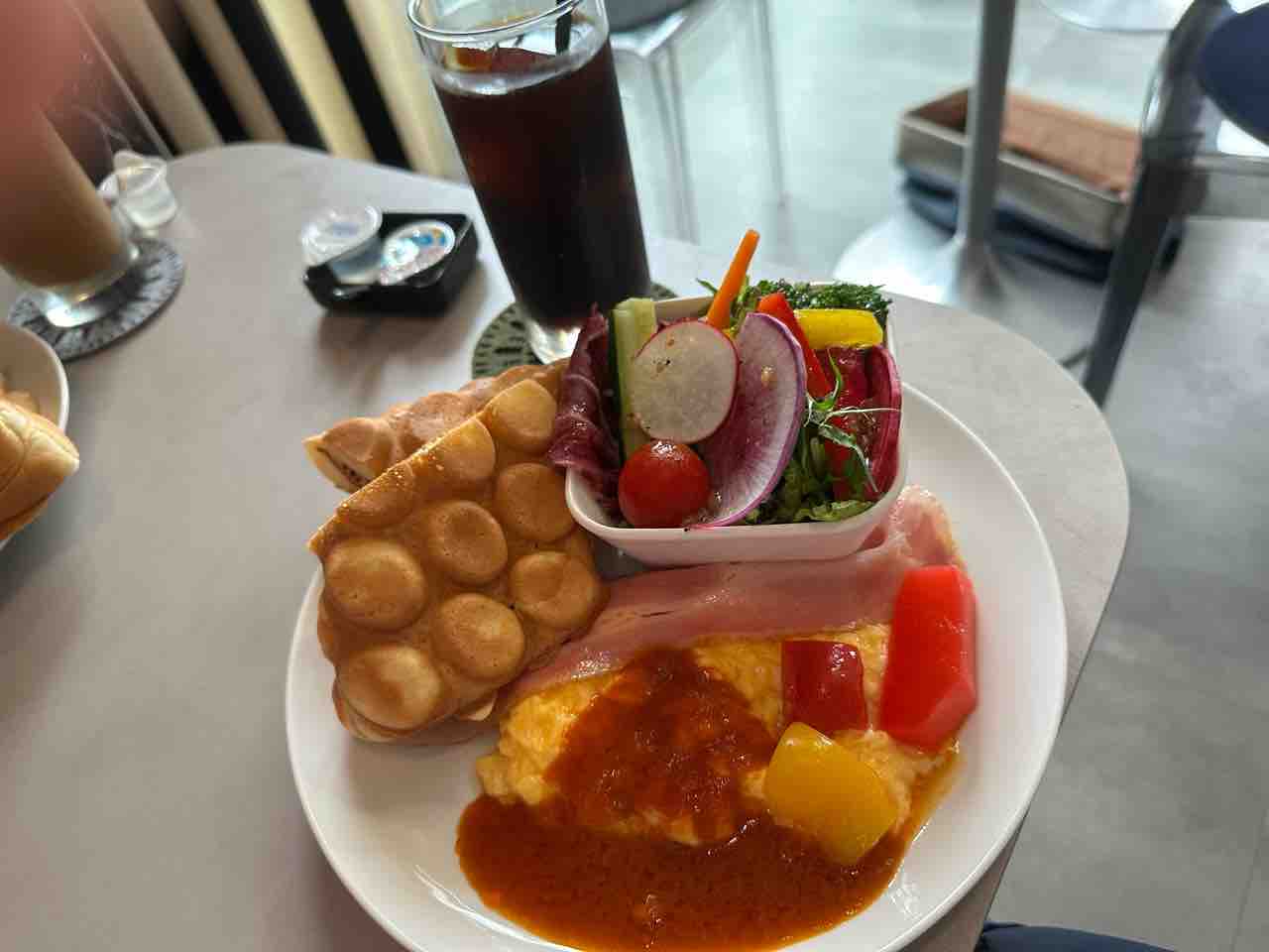 泡のような丸い焼き型が特徴のワッフルは、外は香ばしくサクッと、中はしっとりふんわりした食感で、ほんのりとした甘みが朝にぴったり。